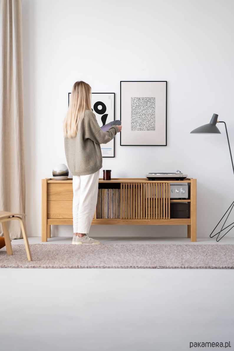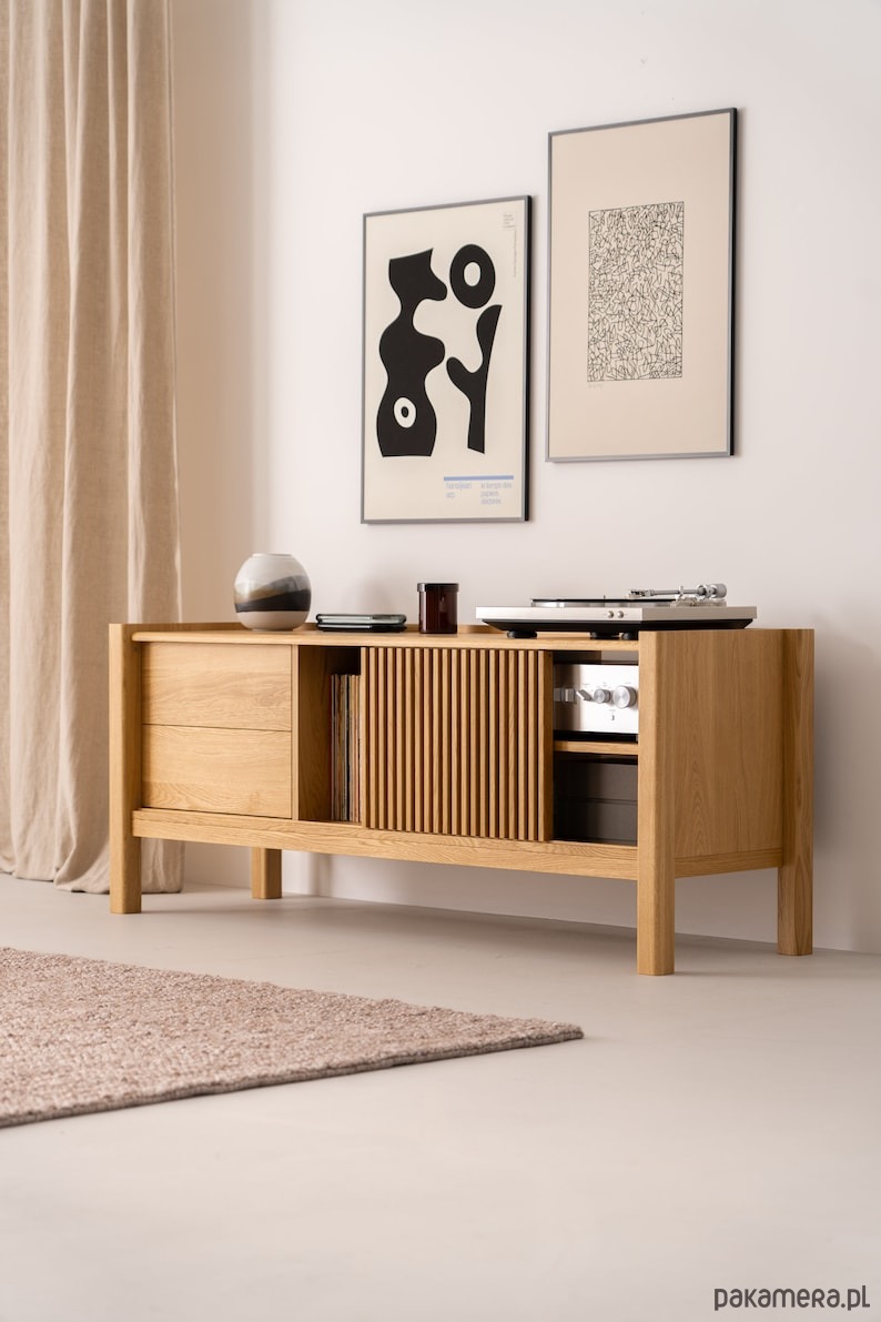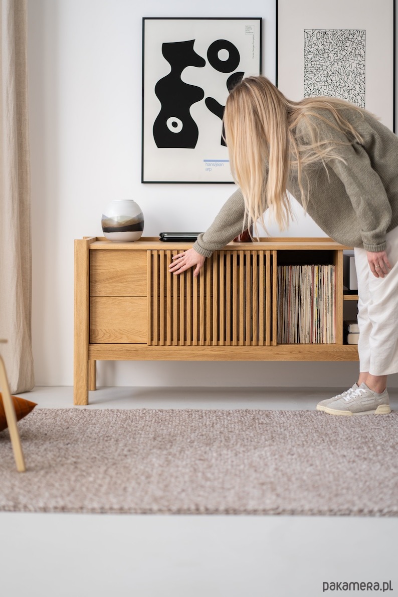 JAMM LOW szafka wykonana z litego drewna dębowego, która nie tylko przechowuje kolekcję winyli, ale staje się również sercem muzycznych doznań.