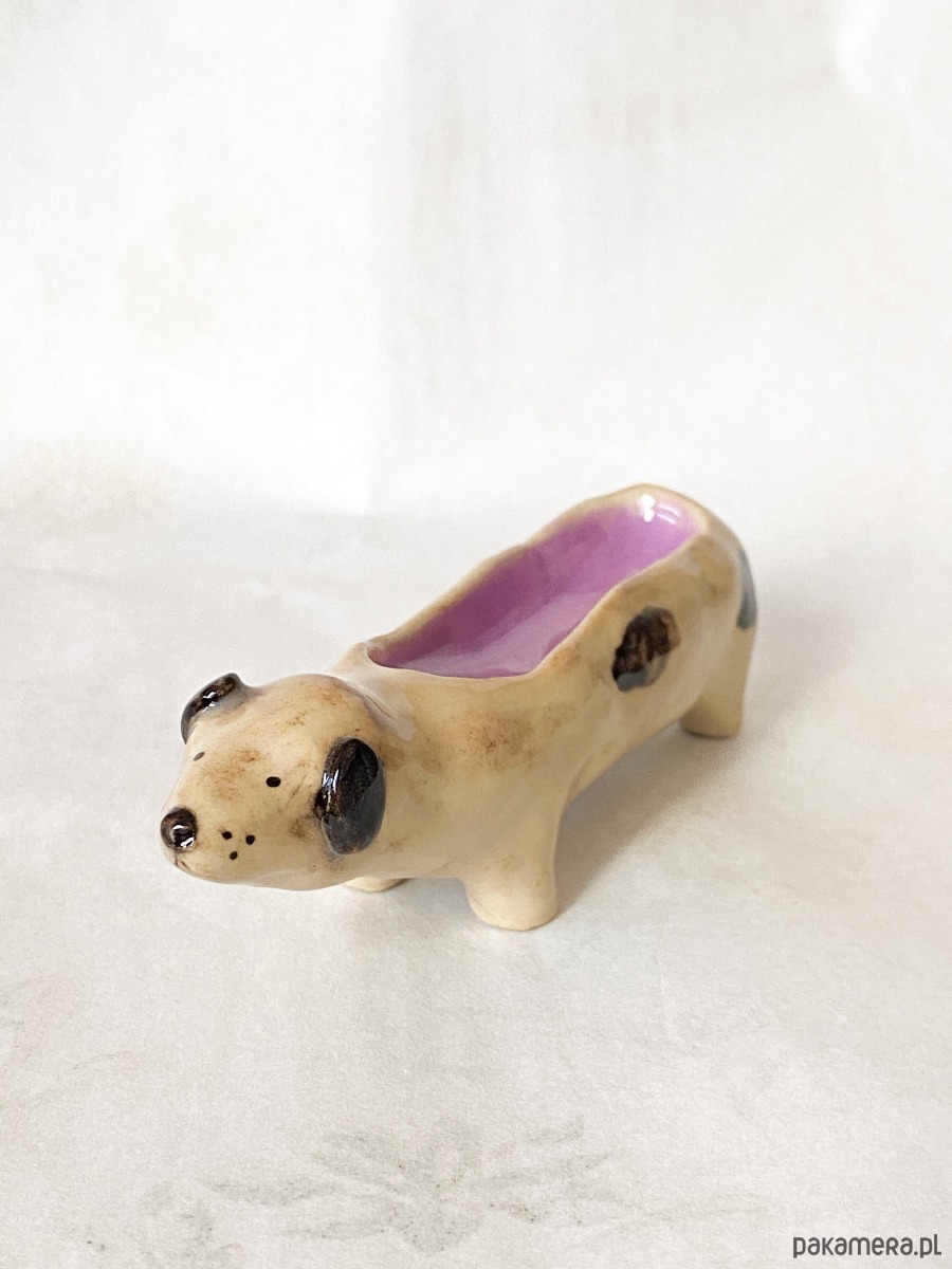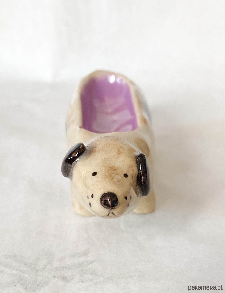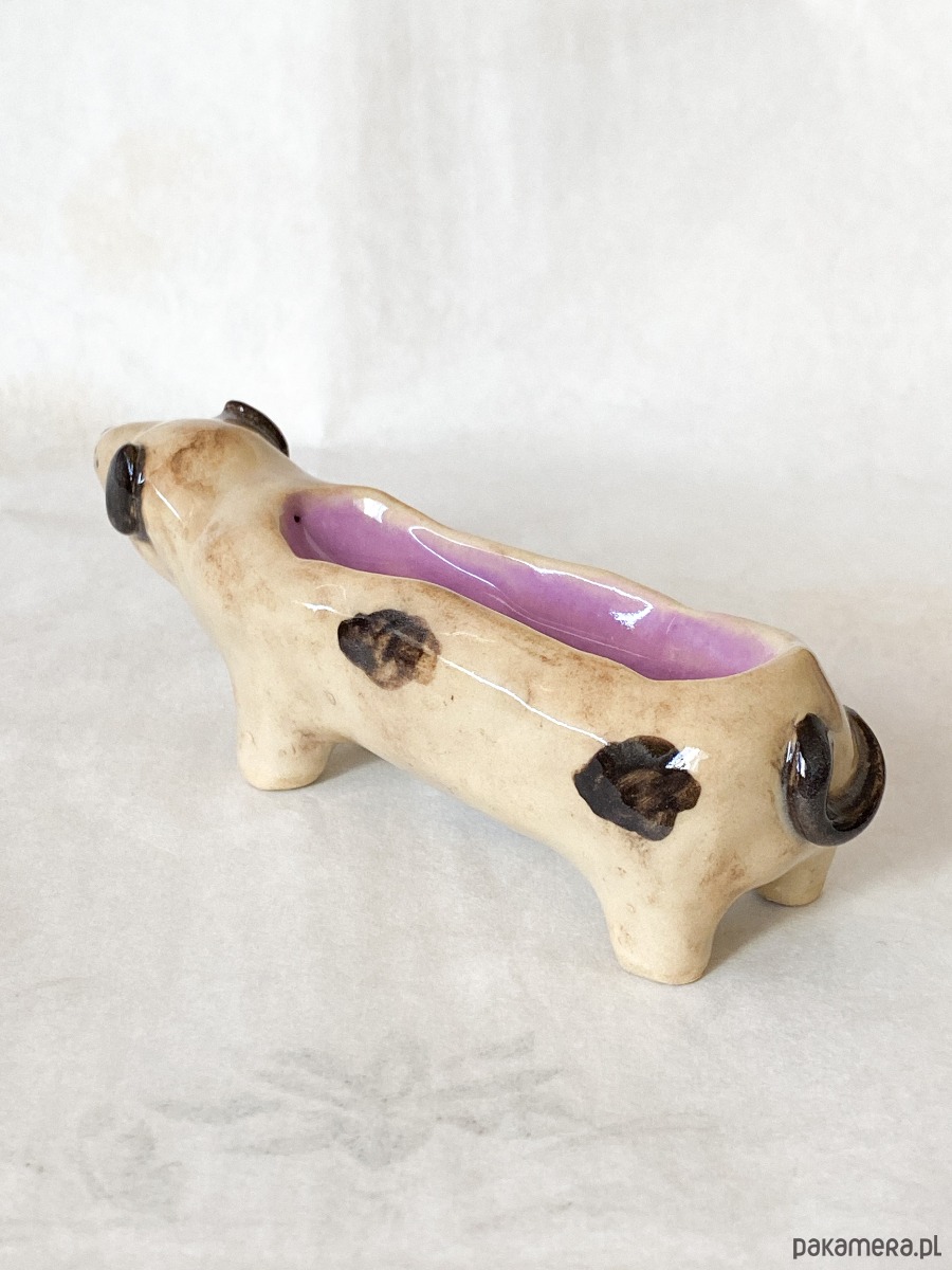 Lepiony ręcznie z gliny, dekorowany farbkami podszkliwnymi i szkliwem kolorowym i transparentnym. Kolor po bokach beżowy ze środkiem różowym/fioletowym.