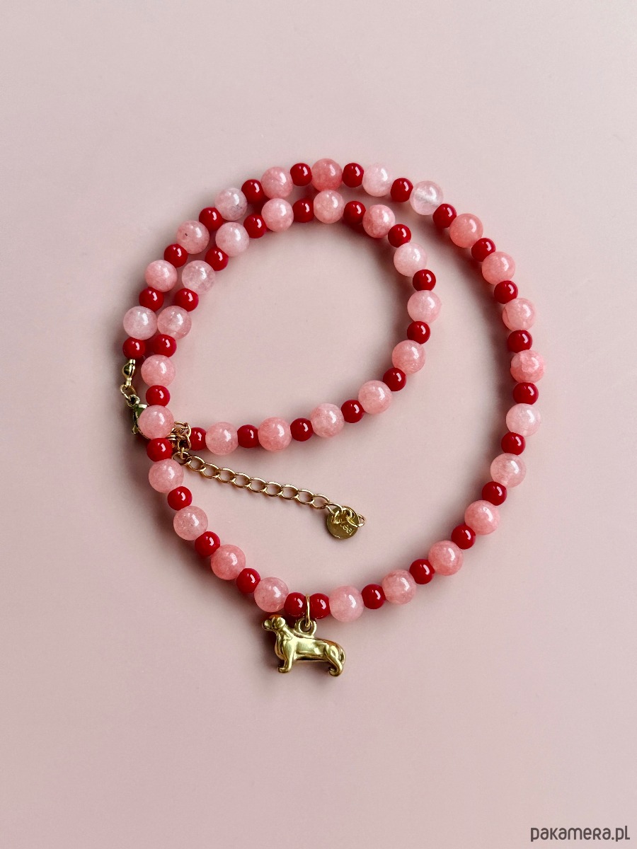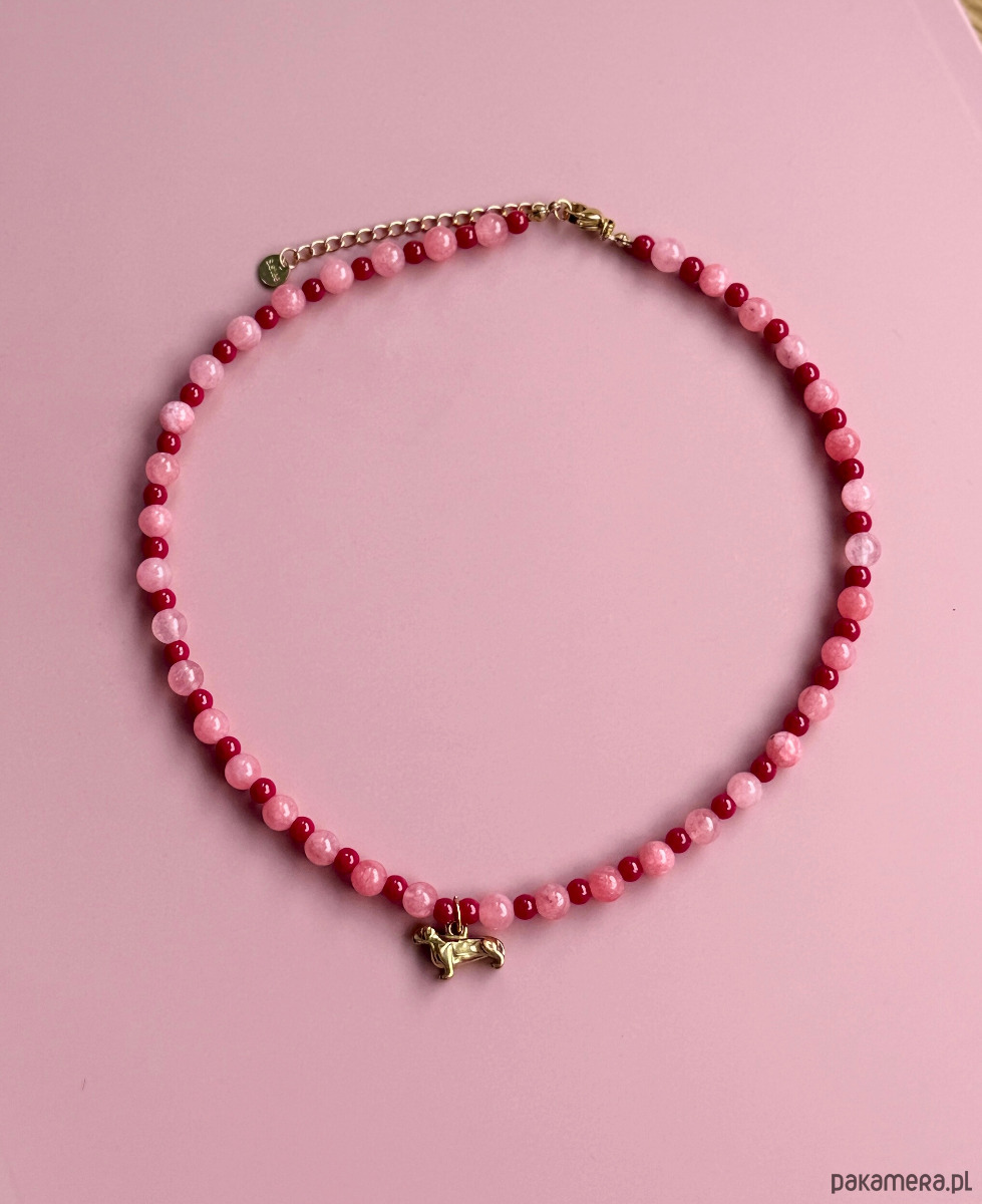 Naszyjnik z różowego jadeitu, przeplatanego czerwonymi koralikami z uroczą zawieszką w kształcie pieska jamniczka ze stali szlachetnej.