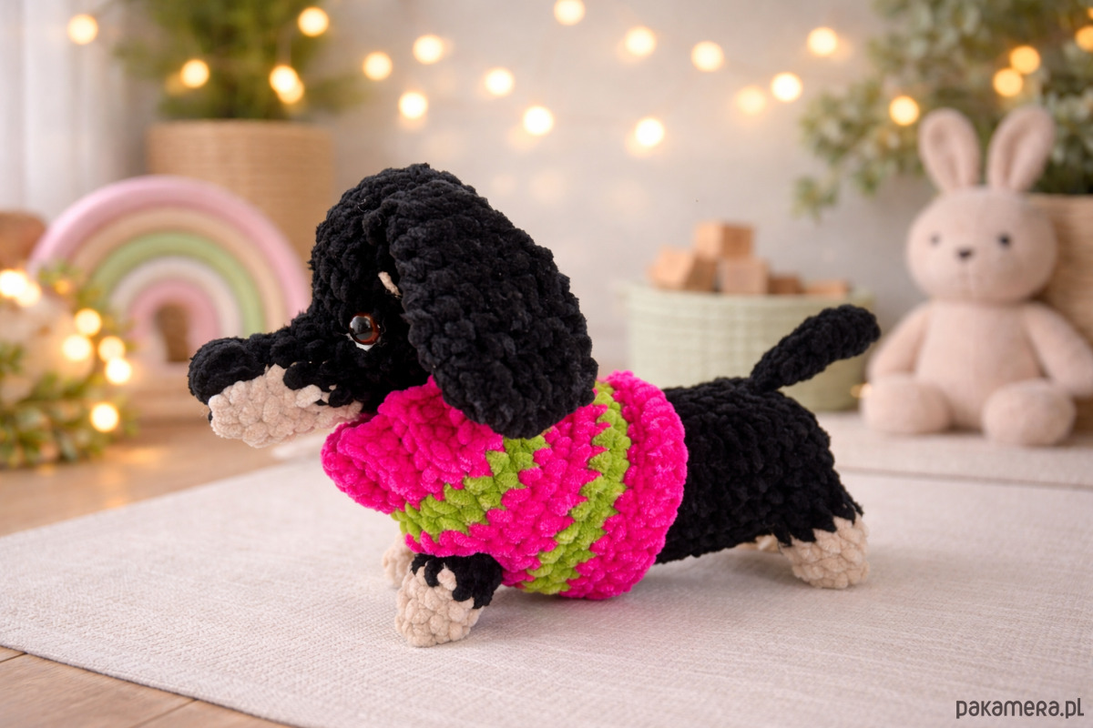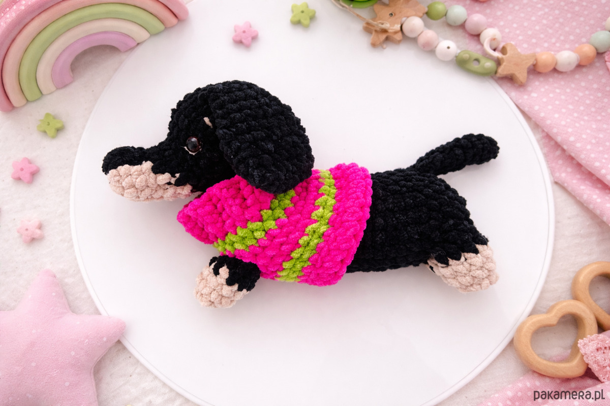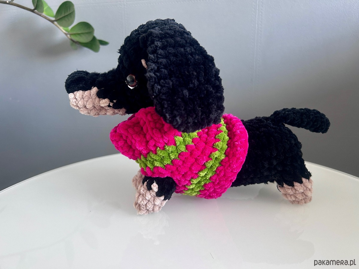 Powstał u mnie ostatnio taki uroczy maluch — czarny jamniczek z beżowymi łapkami, w kolorowym sweterku w odcieniach różu i soczystej zieleni 💗🌿