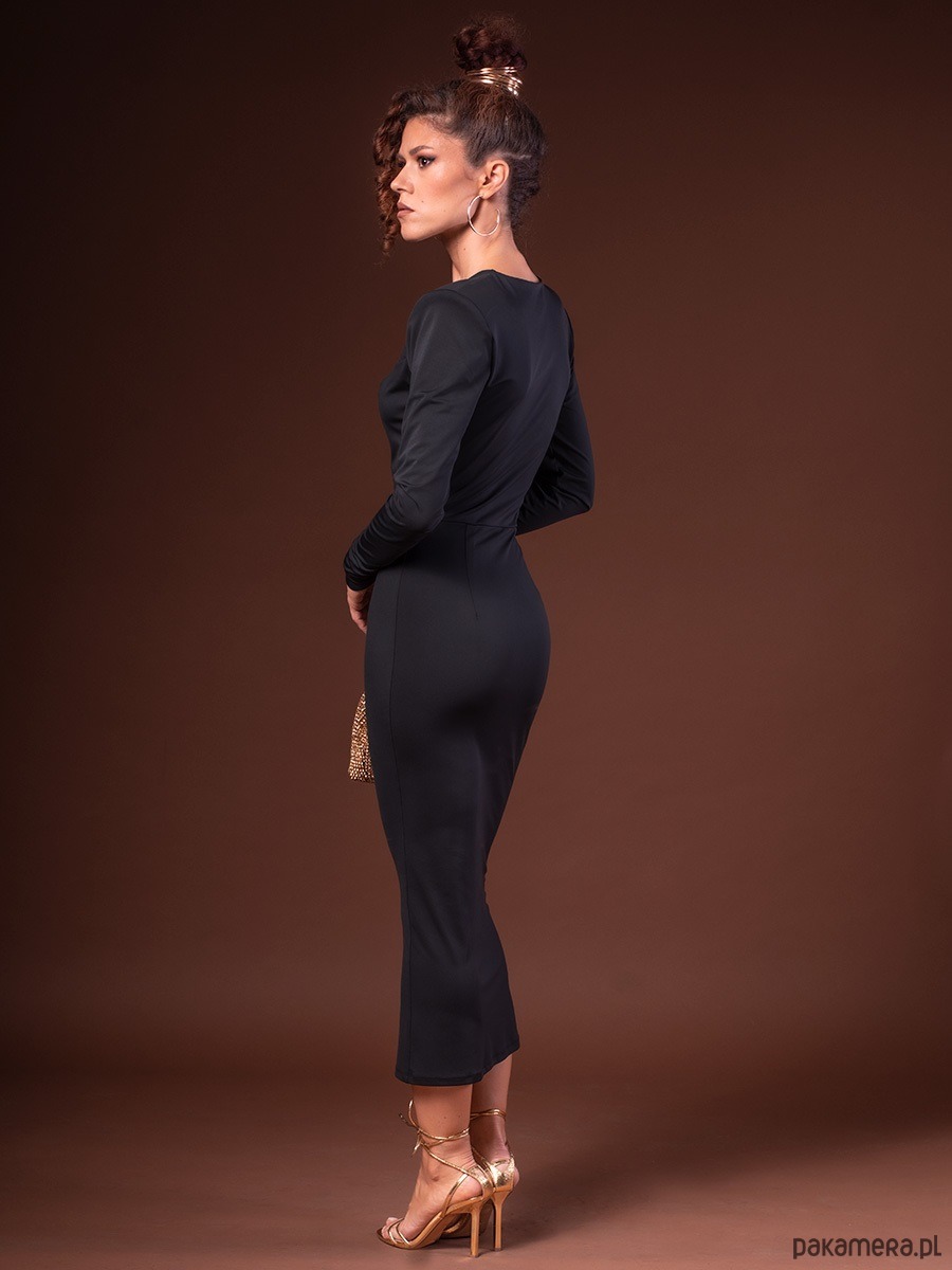 Sukienka świetnie prezentuje się ze złotymi lub srebrnymi minimalistycznymi dodatkami. Możesz ją nosić z kozakami o dopasowanych cholewkach, sandałkami lub eleganckimi czółenkami.