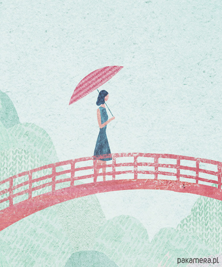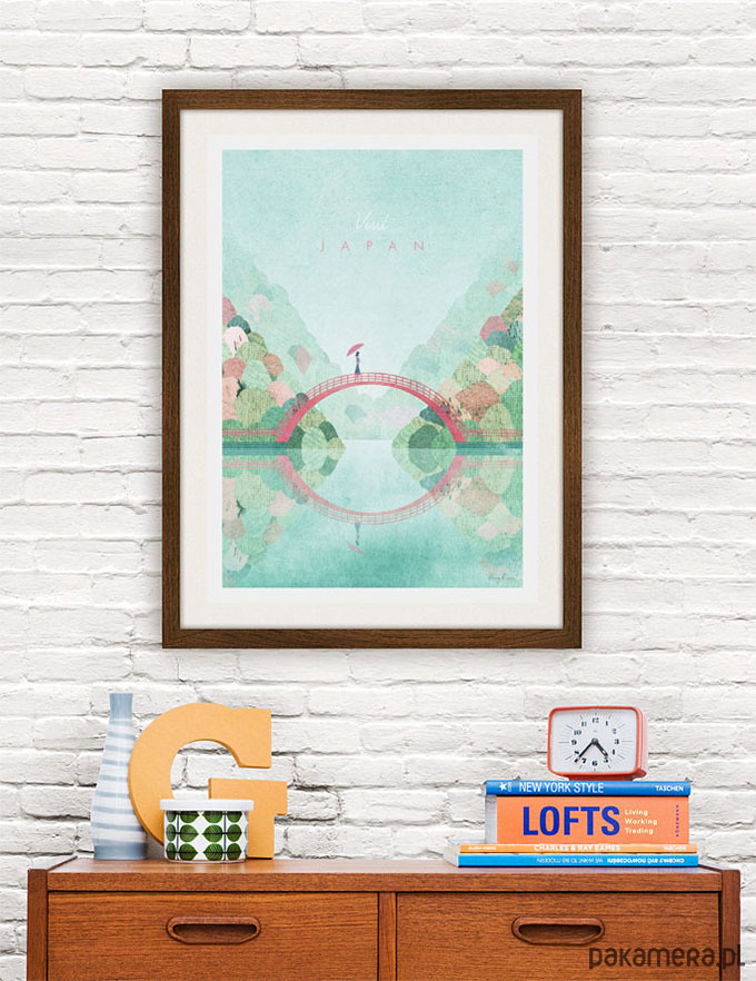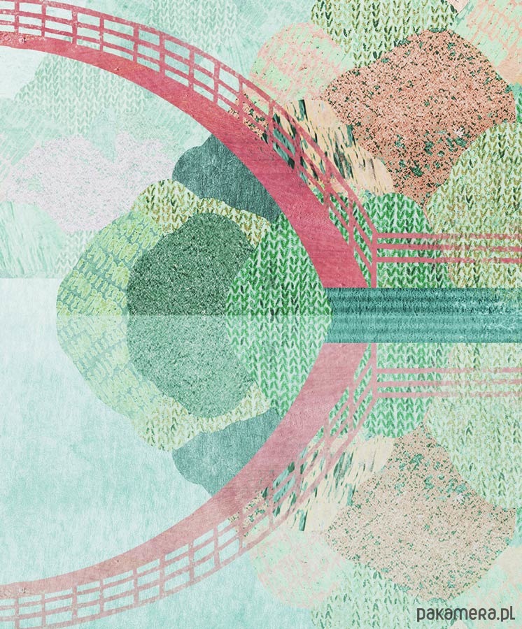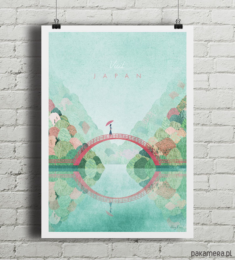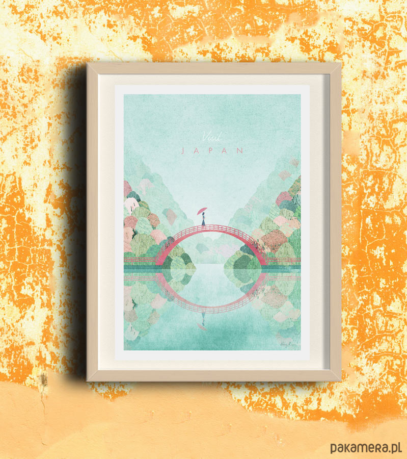 Plakat w stylu vintage przedstawiający kobietę spacerująca po tradycyjnym moście w scenerii jesiennego japońskiego ogrodu. Symetria sceny podkreślona jest przez refleksy na tafli jeziora. Inspirowany plakatami podróżniczymi z lat 20-tych XX wieku.