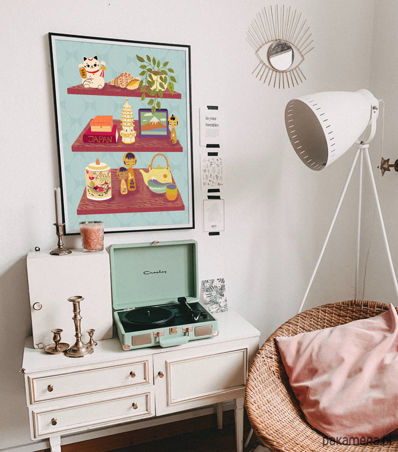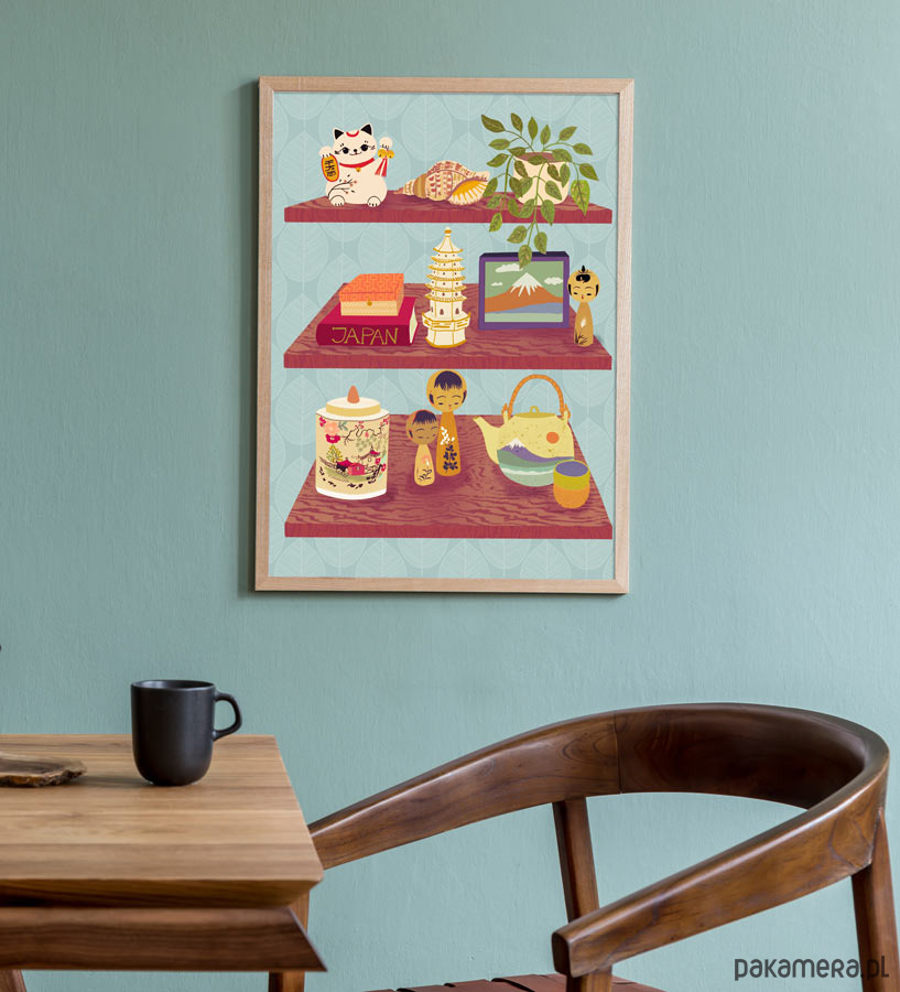 Plakat w stylu skandynawskim z autorską grafiką przedstawiającą półki wypełnione przedmiotami związanymi z Japonią. Oryginalna dekoracja do wymarzonego salonu bądź kuchni. Zaprojektowany przez artystkę Elisandrę Sevenstar.