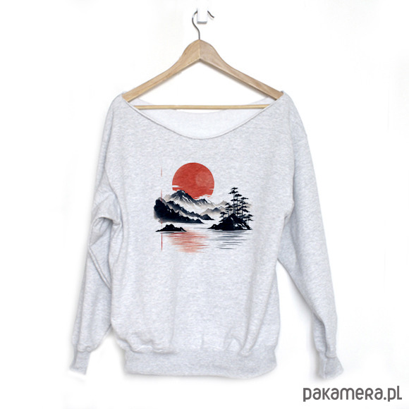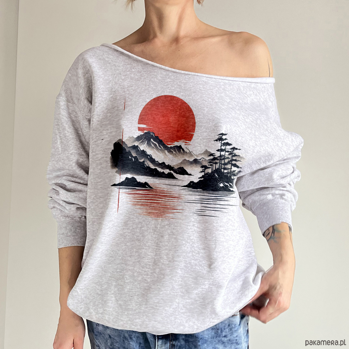 Nadruk cyfrowy. Szeroki dekolt. Cięte wykończenie dekoltu, rękawy i dół bluzy ze ściągaczami.