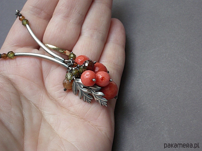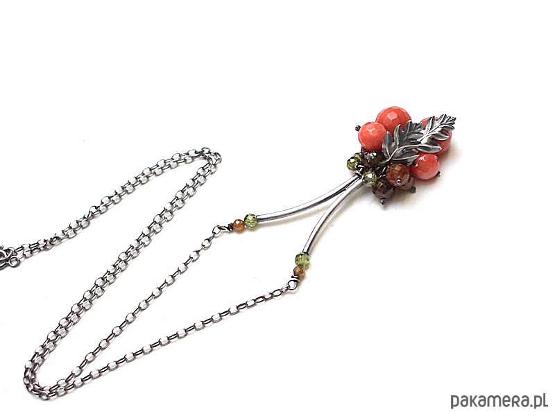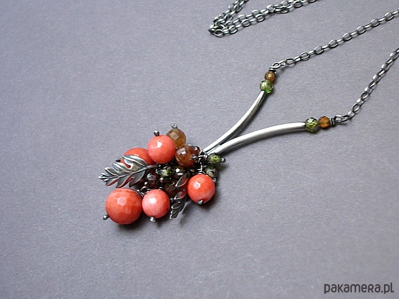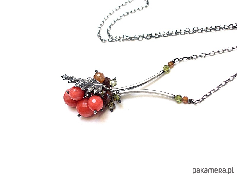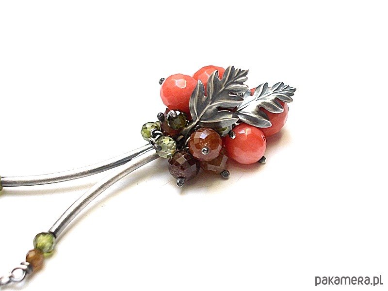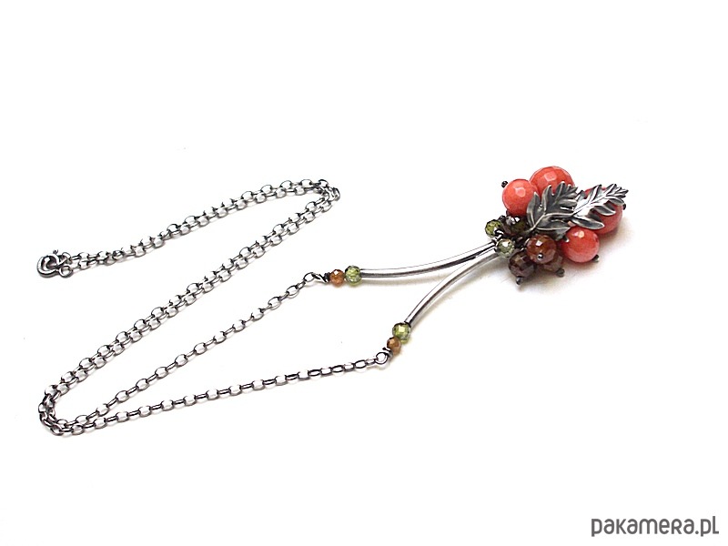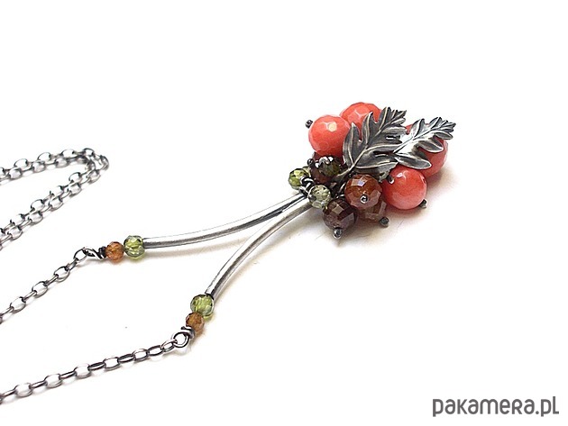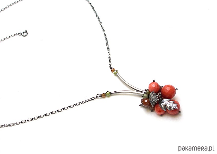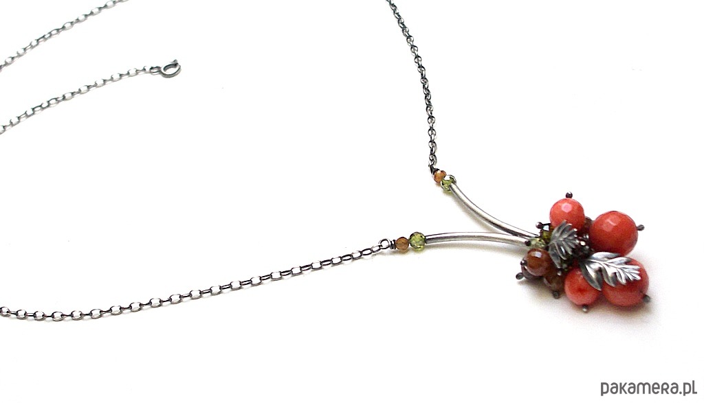 Naszyjnik wykonany ze srebra [pr. 925] w połączeniu z fasetowanym koralem robaczywką w pomarańczowym kolorze [10mm i 7mm], fasetowanymi granatami [4mm i 6mm - hessonit], fasetowanymi cyrkoniami [4mm] oraz srebrnymi listkami. Całość oksydowana i przetarta. Całkowita długość naszyjnika 50cm, długość części wiszącej: 7cm. Biżuteria ozdobnie zapakowana