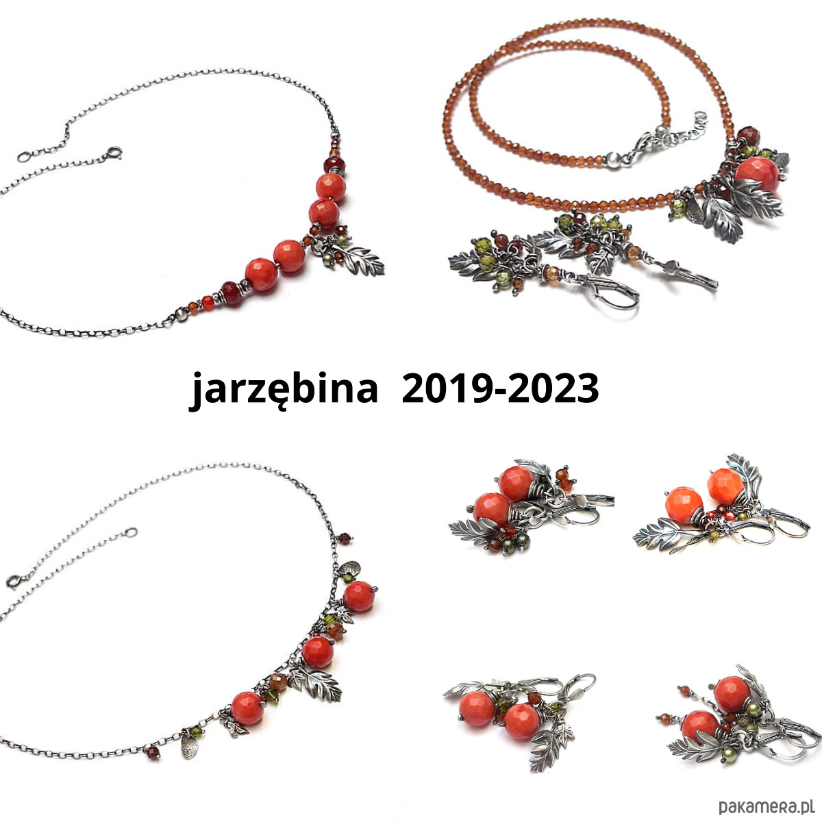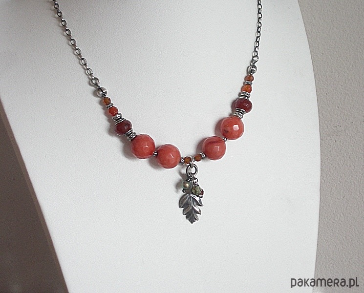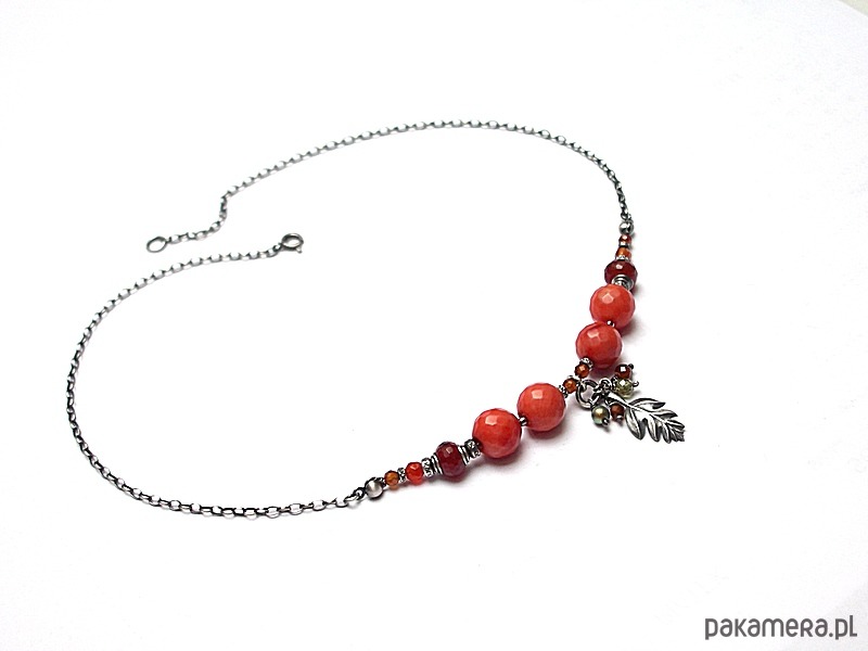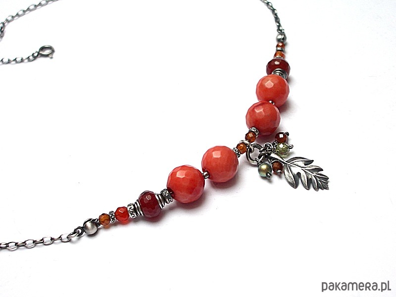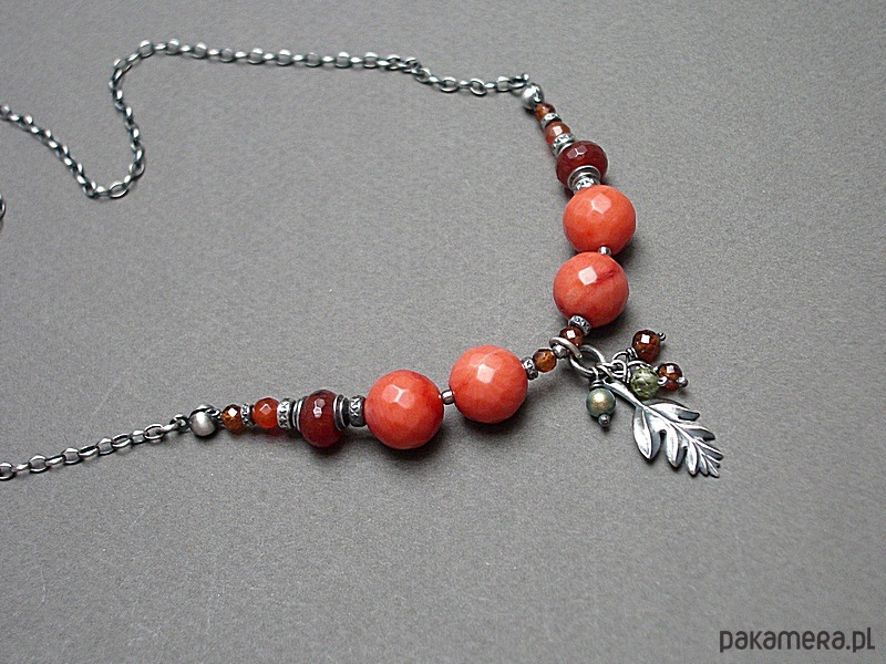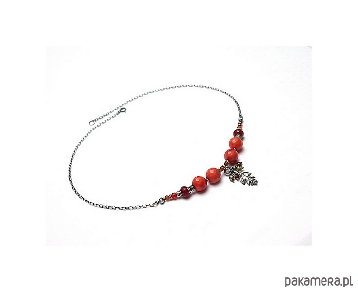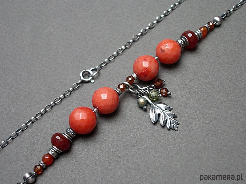 Naszyjnik wykonany ze srebra [pr. 925] w połączeniu z fasetowanym koralem robaczywką w pomarańczowym kolorze [12mm], fasetowanymi granatami [3mm i 4mm - hessonit], fasetowanymi oponkami karneolu [8mm], perłą Swarovski [4mm] ,cyrkonią [4mm] oraz srebrnym listkiem. Całość oksydowana i przetarta. Całkowita długość naszyjnika 44,5cm. Biżuteria ozdobnie zapakowana.