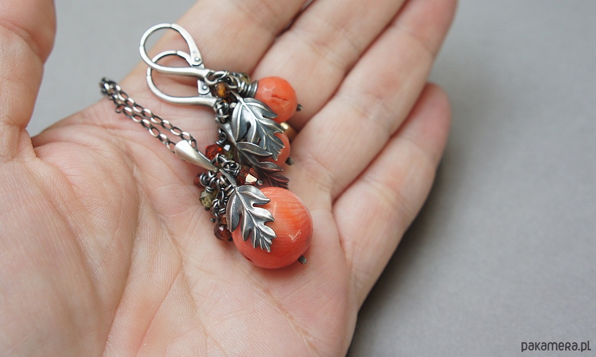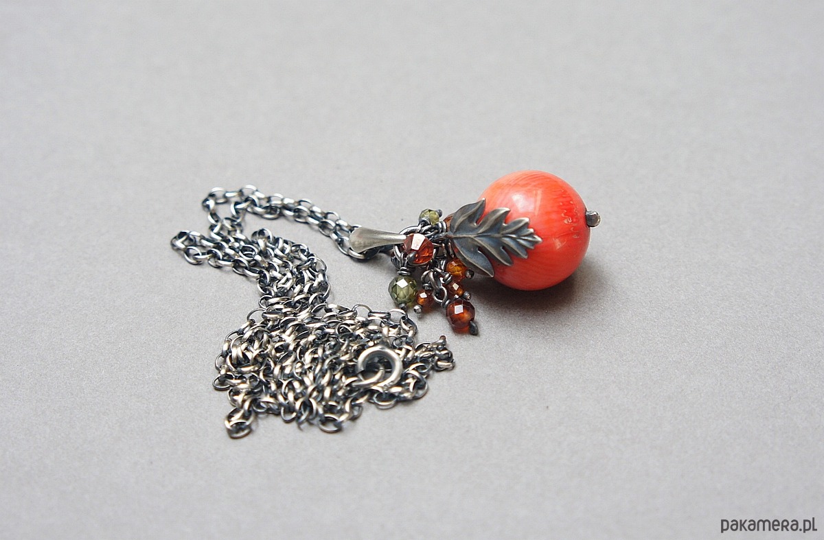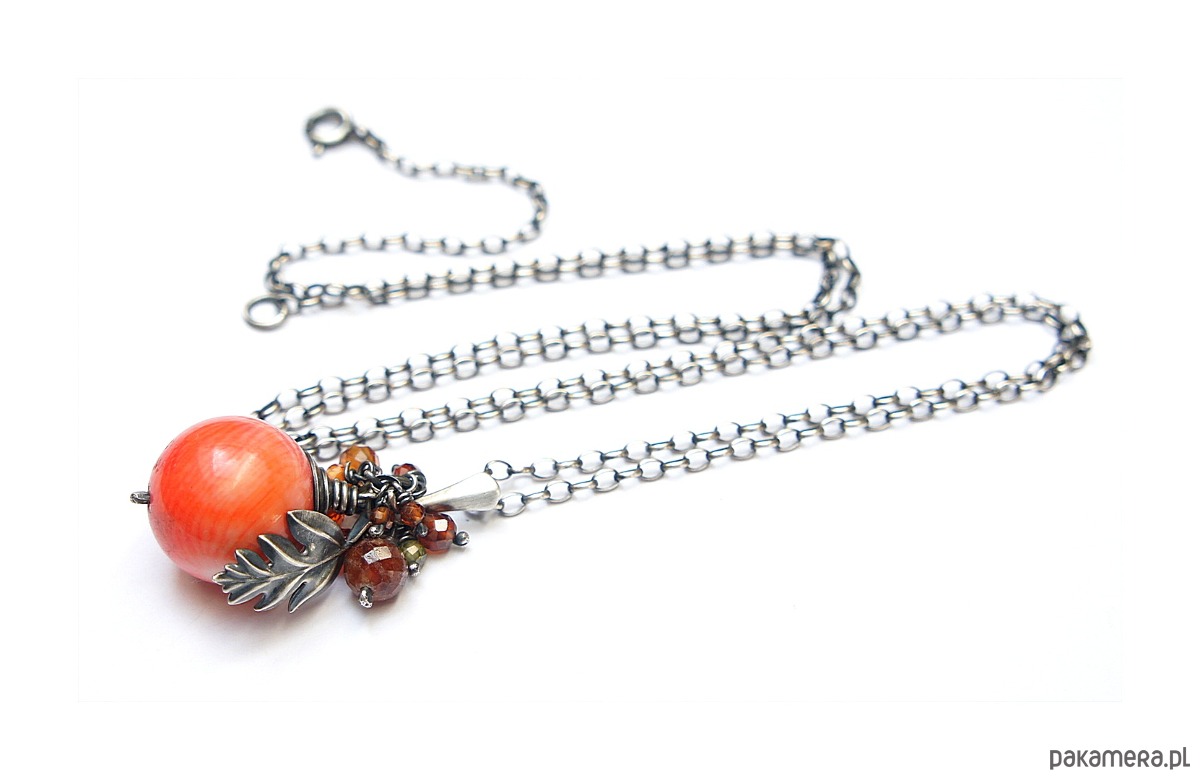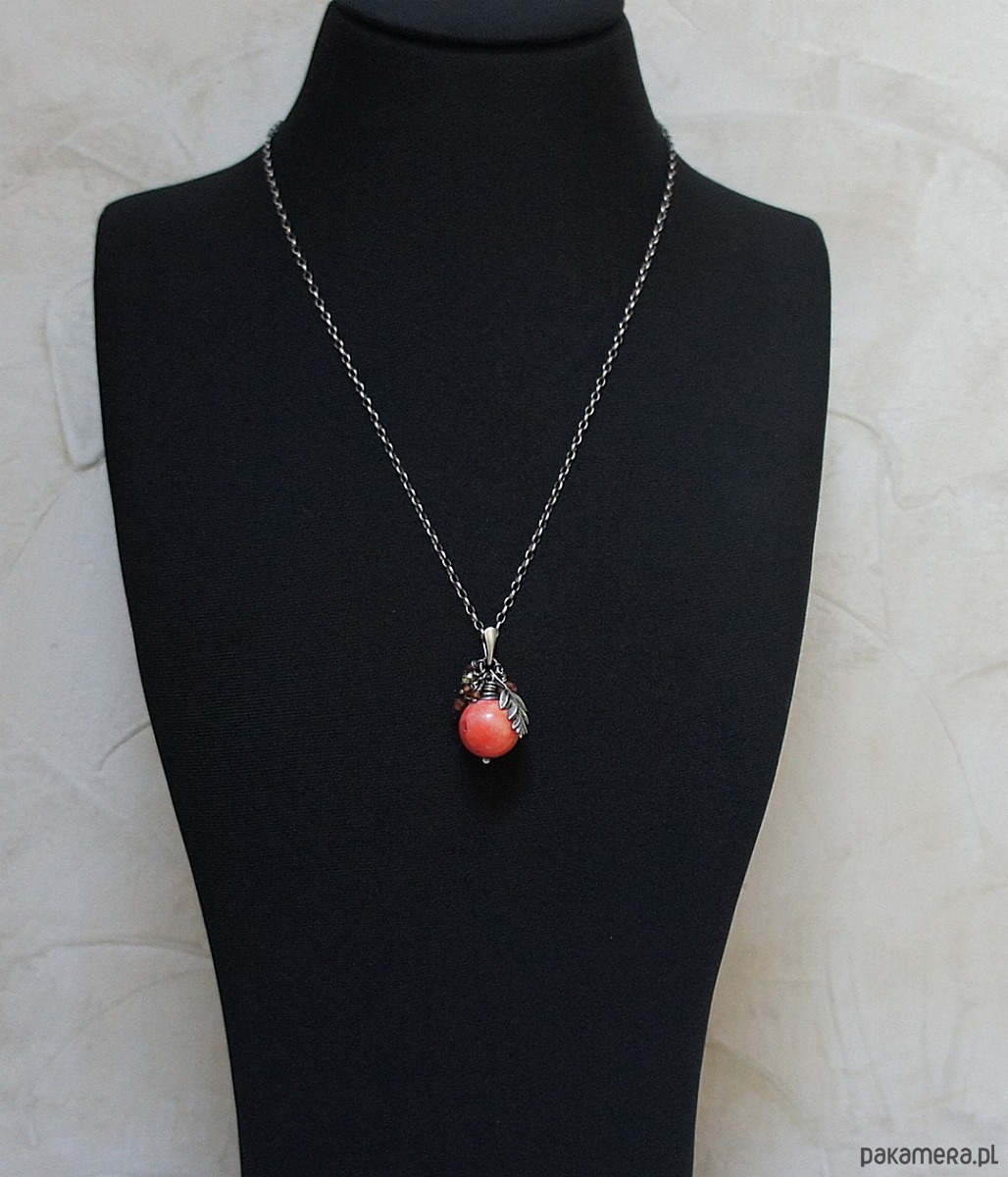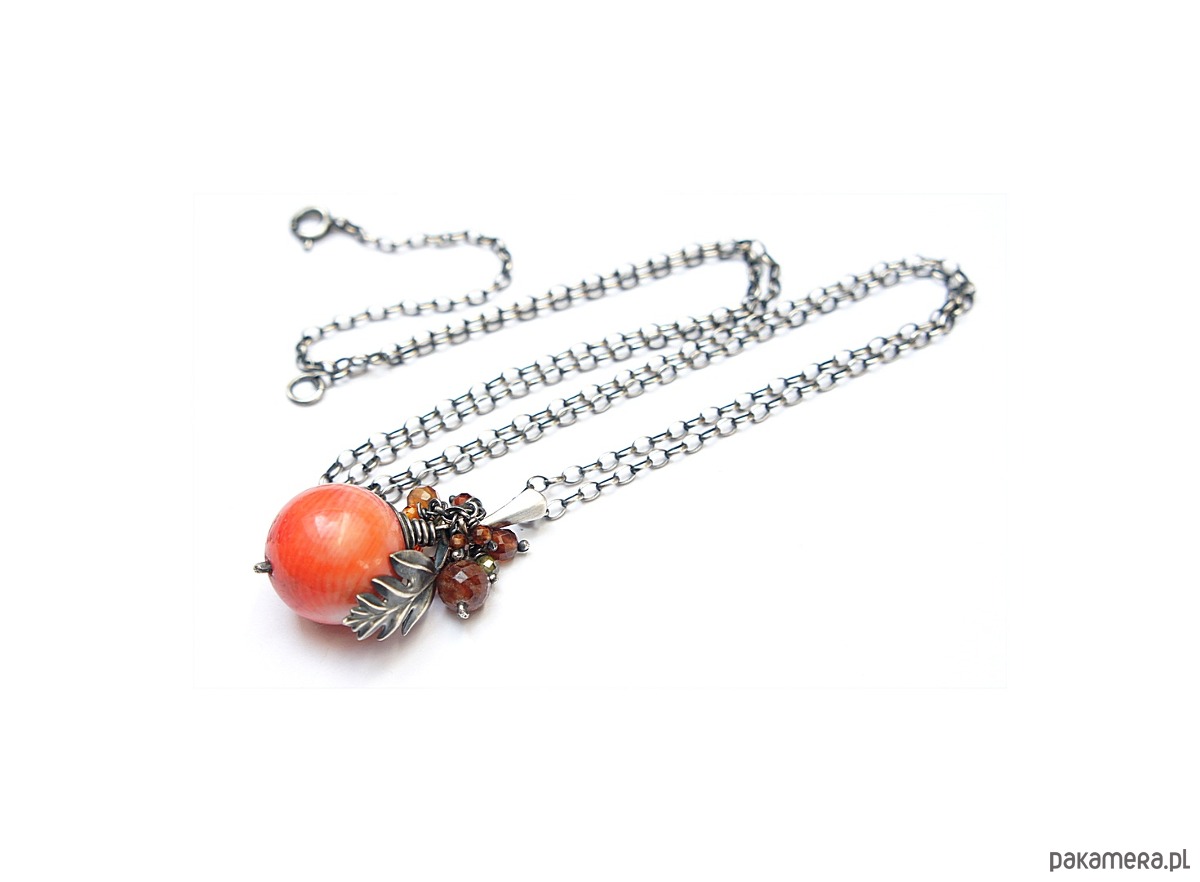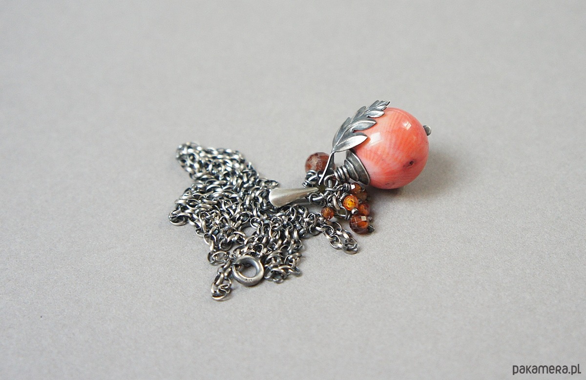 Naszyjnik wykonany ze srebra [pr. 925] w połączeniu z kuleczką korala robaczywki [16mm -naturalne niedoskonałości i wżery widoczne na zdjęciach ], fasetowanymi granatami [6mm ,4mm i 2mm -hessonit], cyrkoniami [4mm i 3mm] oraz srebrnym listkiem . Srebro oksydowane i przetarte. Całkowita długość naszyjnika 69,5cm. Biżuteria ozdobnie zapakowana.