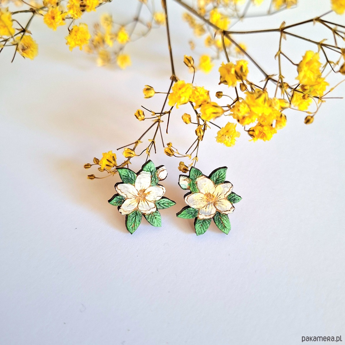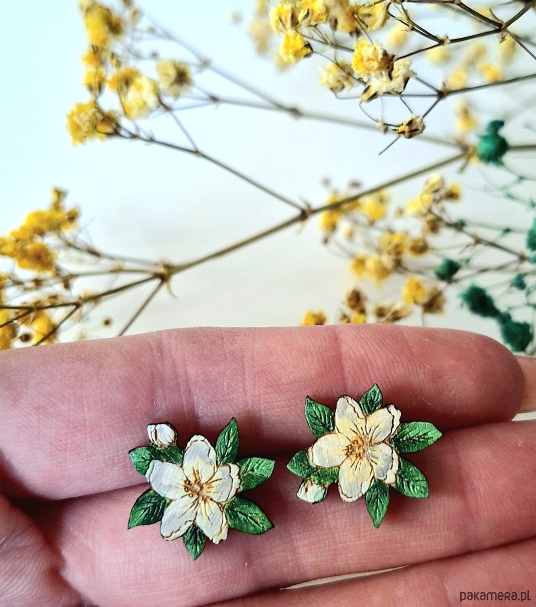 Lekkie kolczyki-sztyfty wykonane na podstawie autorskiego rysunku. Zrobione z drewna i lakierowane. Każda para będzie niepowtarzalna. Wielkość ok 1,5cm. Sztyfty nie uczulą, bo są z silikonu!
