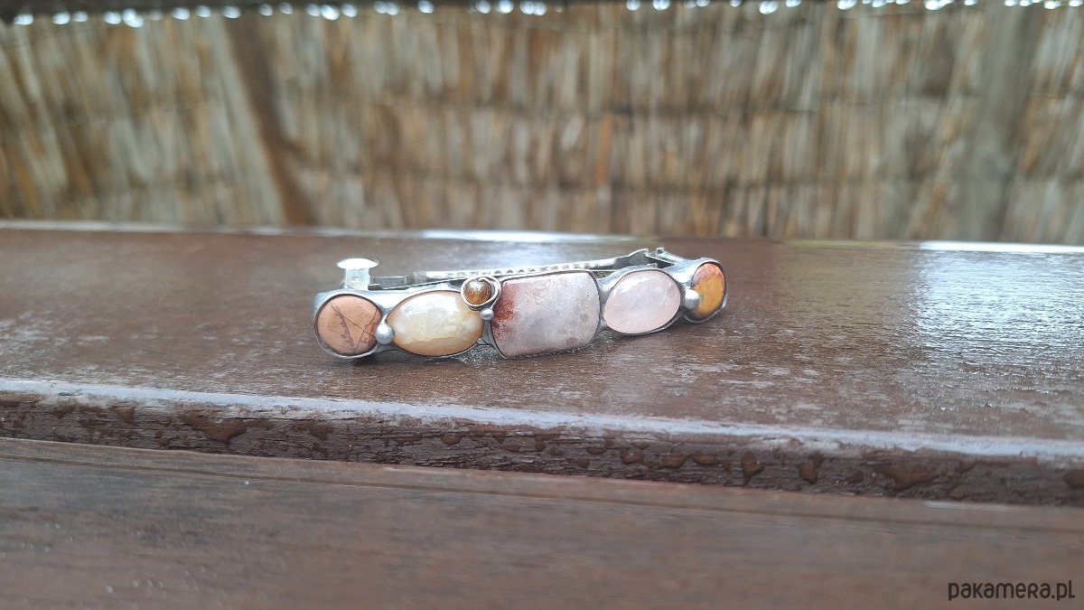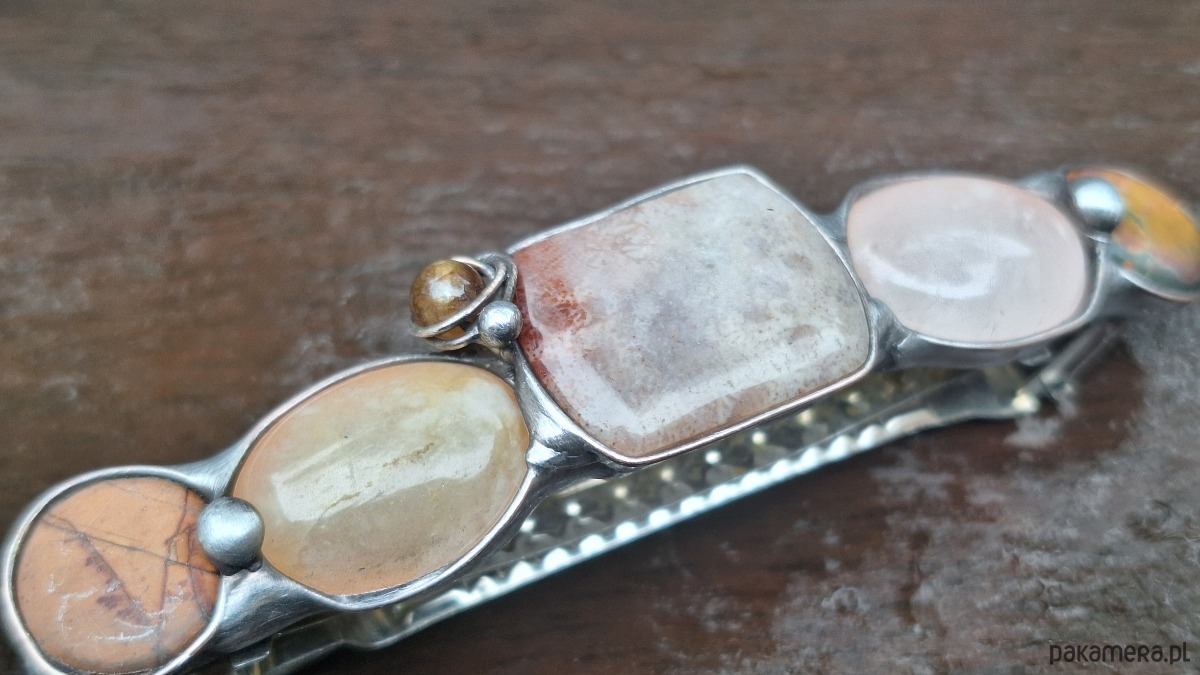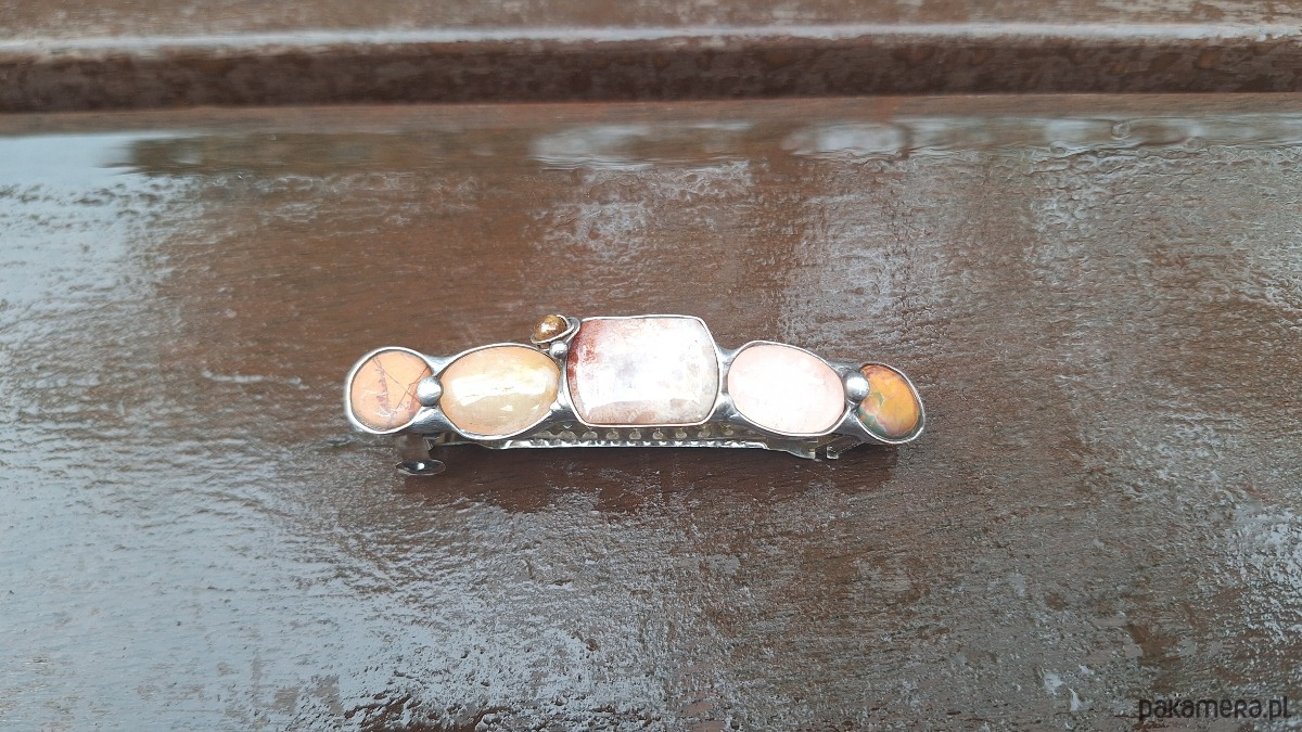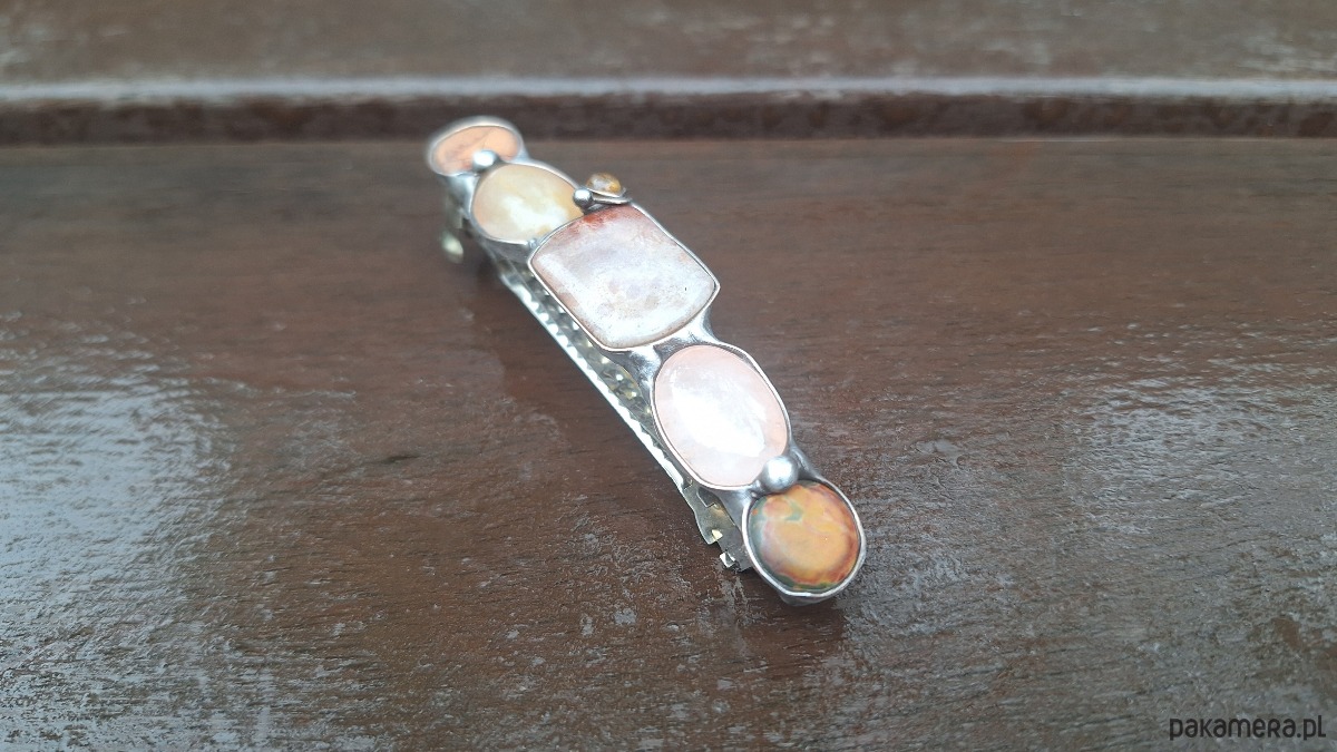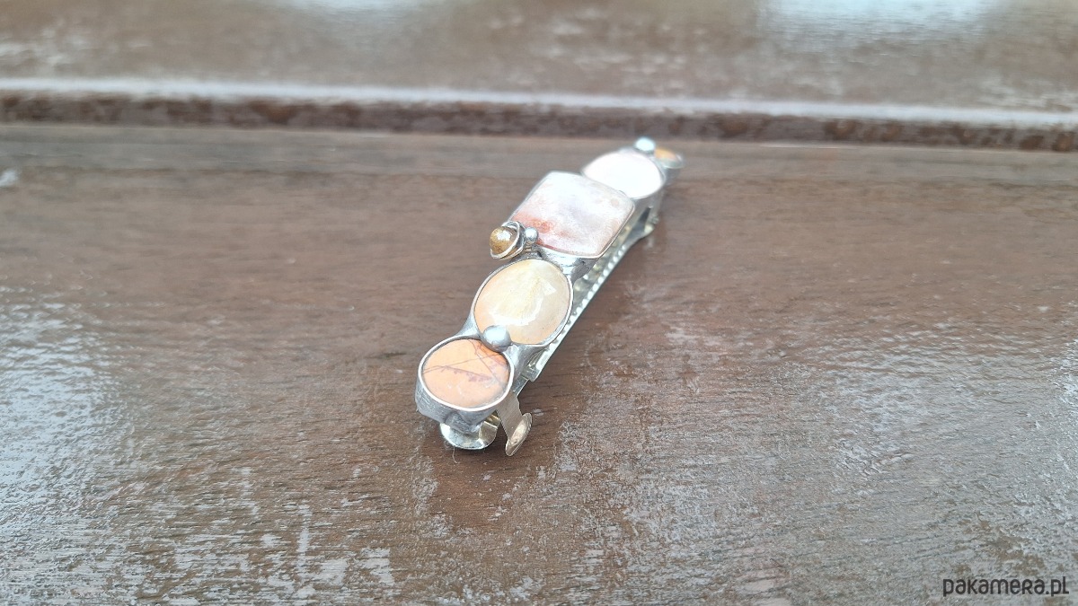 Klamra do włosów, wykonana z miedzi, cyny, koralowca, jaspisu, turmalinu, kwarcu i agatu. Wymiary ok. 8 na 1.5 cm. Zapięcie 6 cm, metalowe.