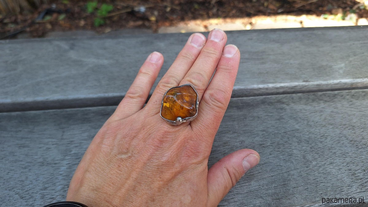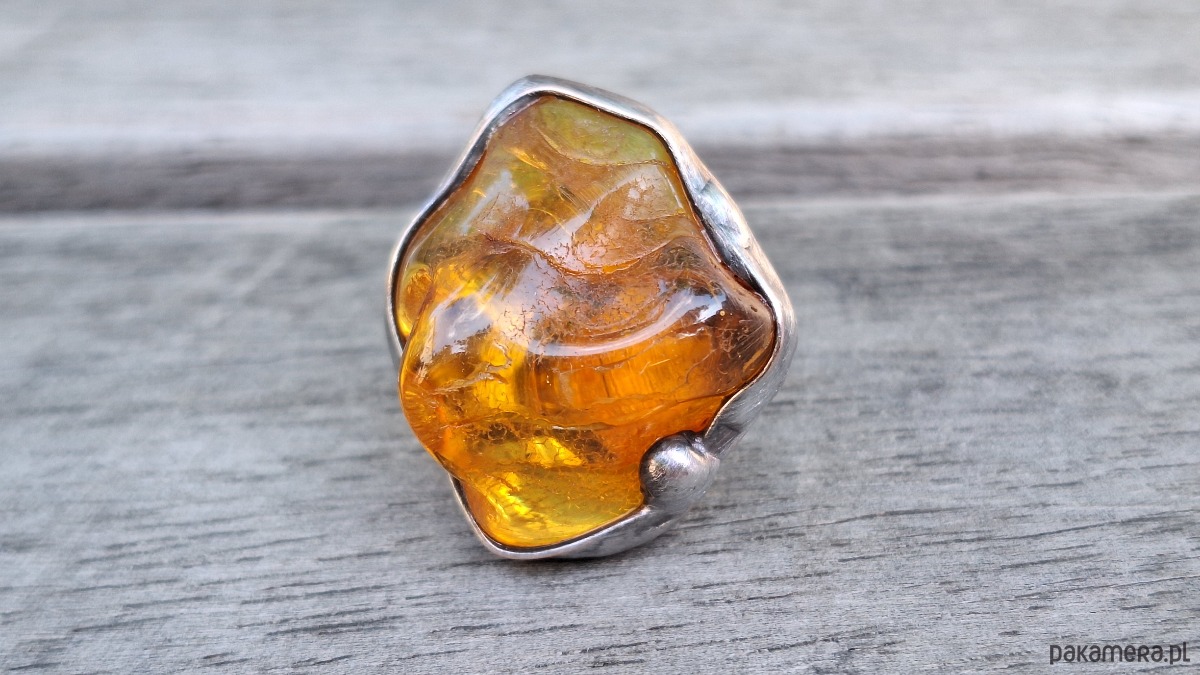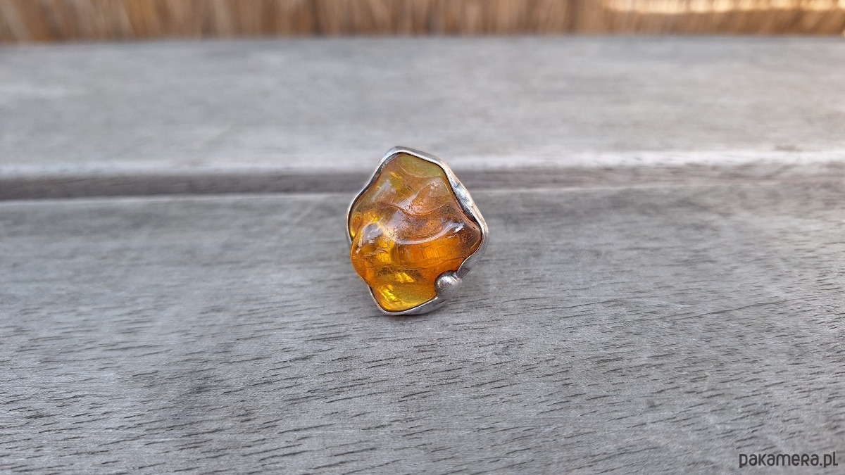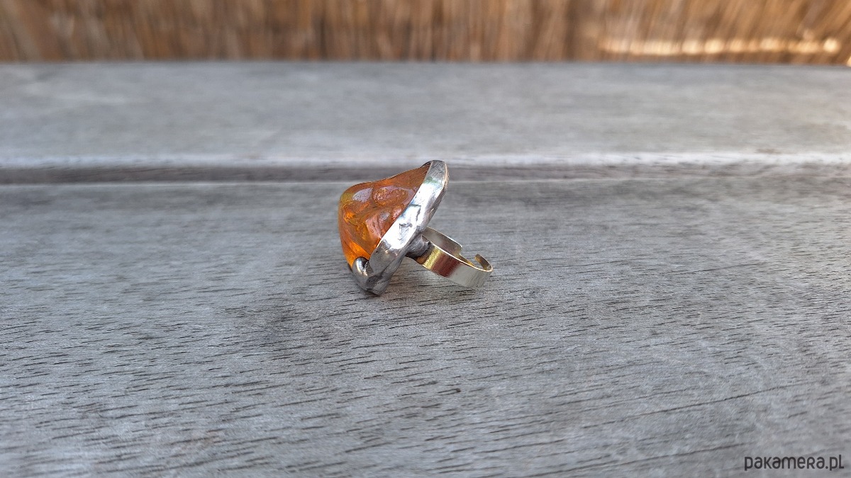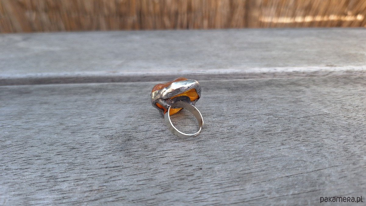 Pierścionek wykonany z miedzi, cyny i bursztynu. Wymiary ok. 3 na 2.5 cm. Regulowany. Nie jest ciężki.