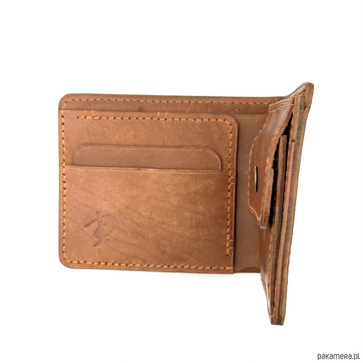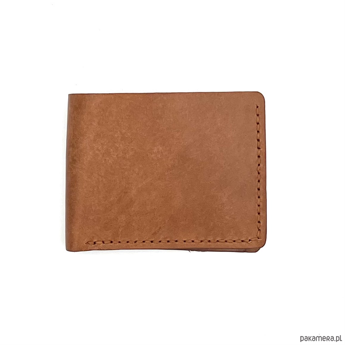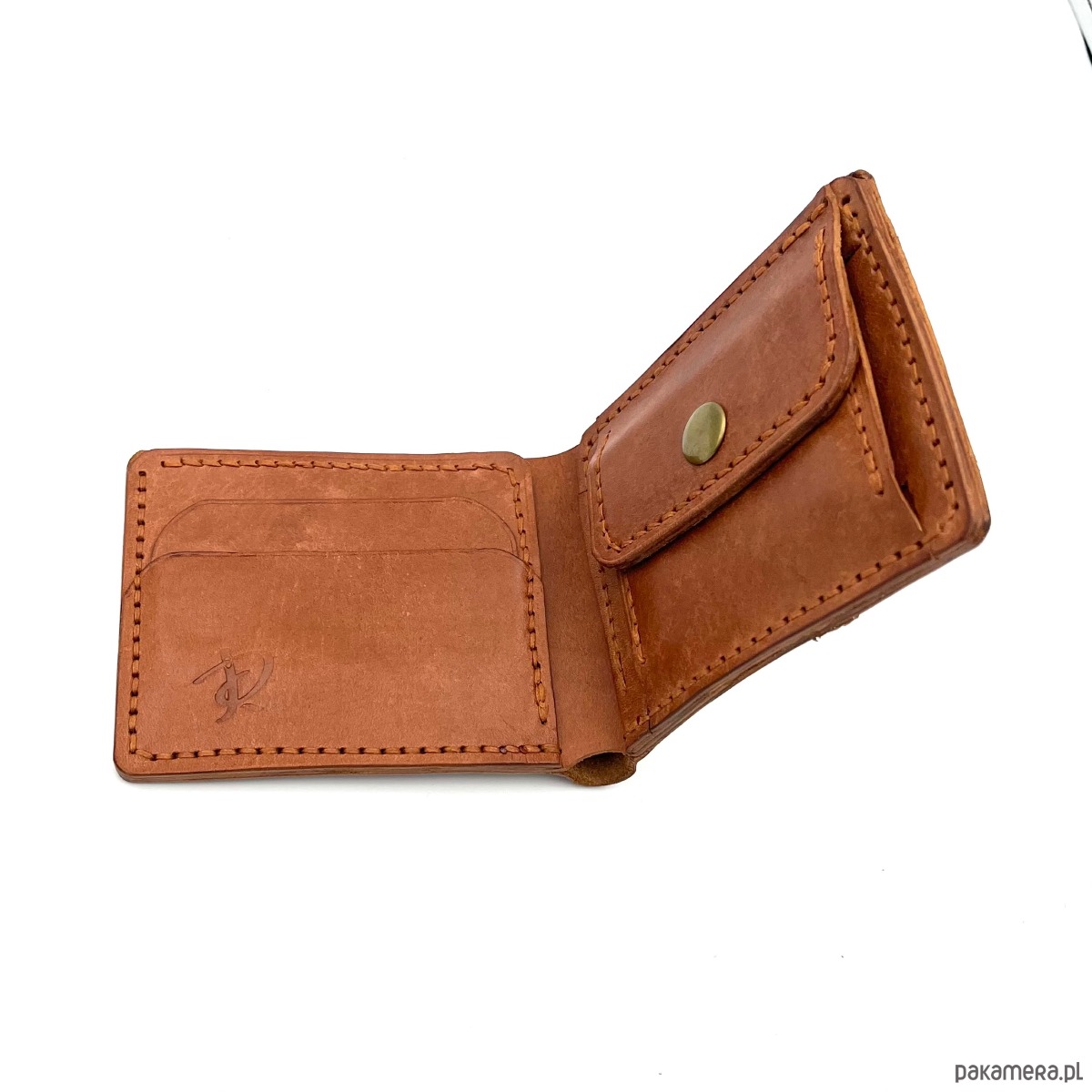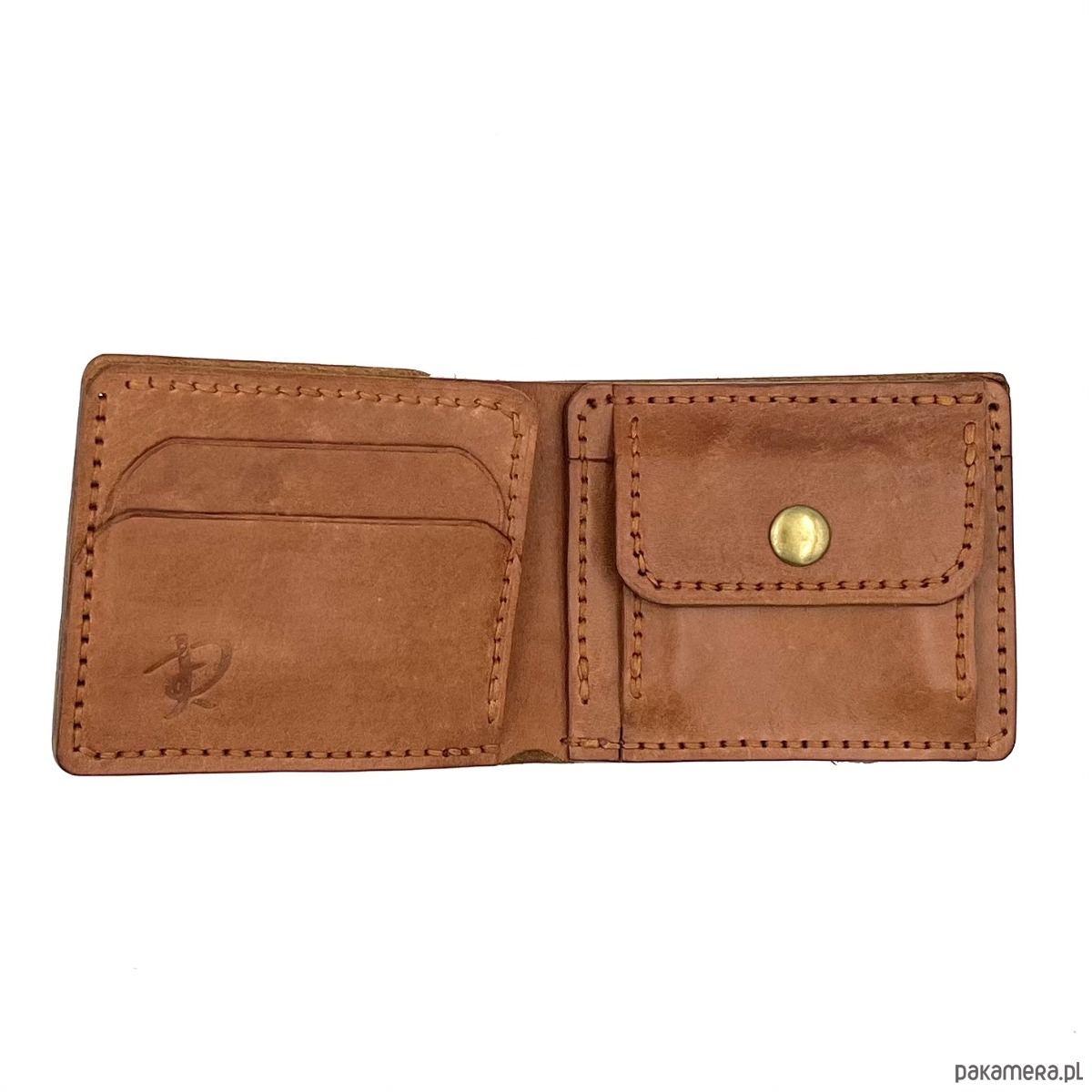 Jasno-brązowy portfel na bilon ręcznie uszyty ze skóry garbowanej roślinnie.
