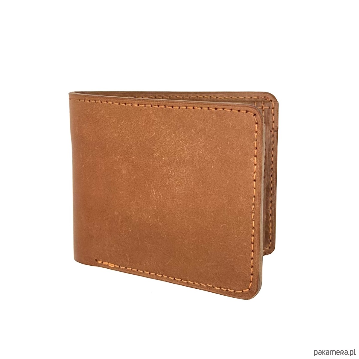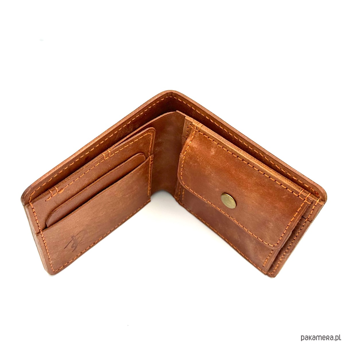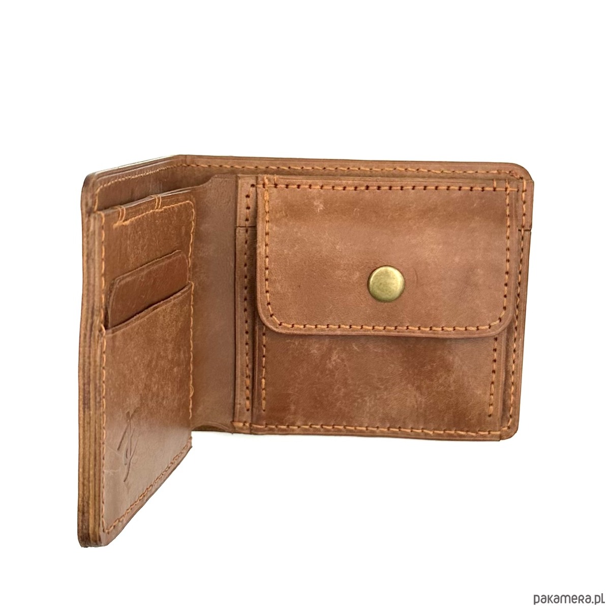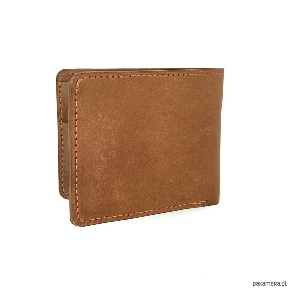 Jasno-brązowy portfel na bilon ręcznie uszyty ze skóry garbowanej roślinnie.