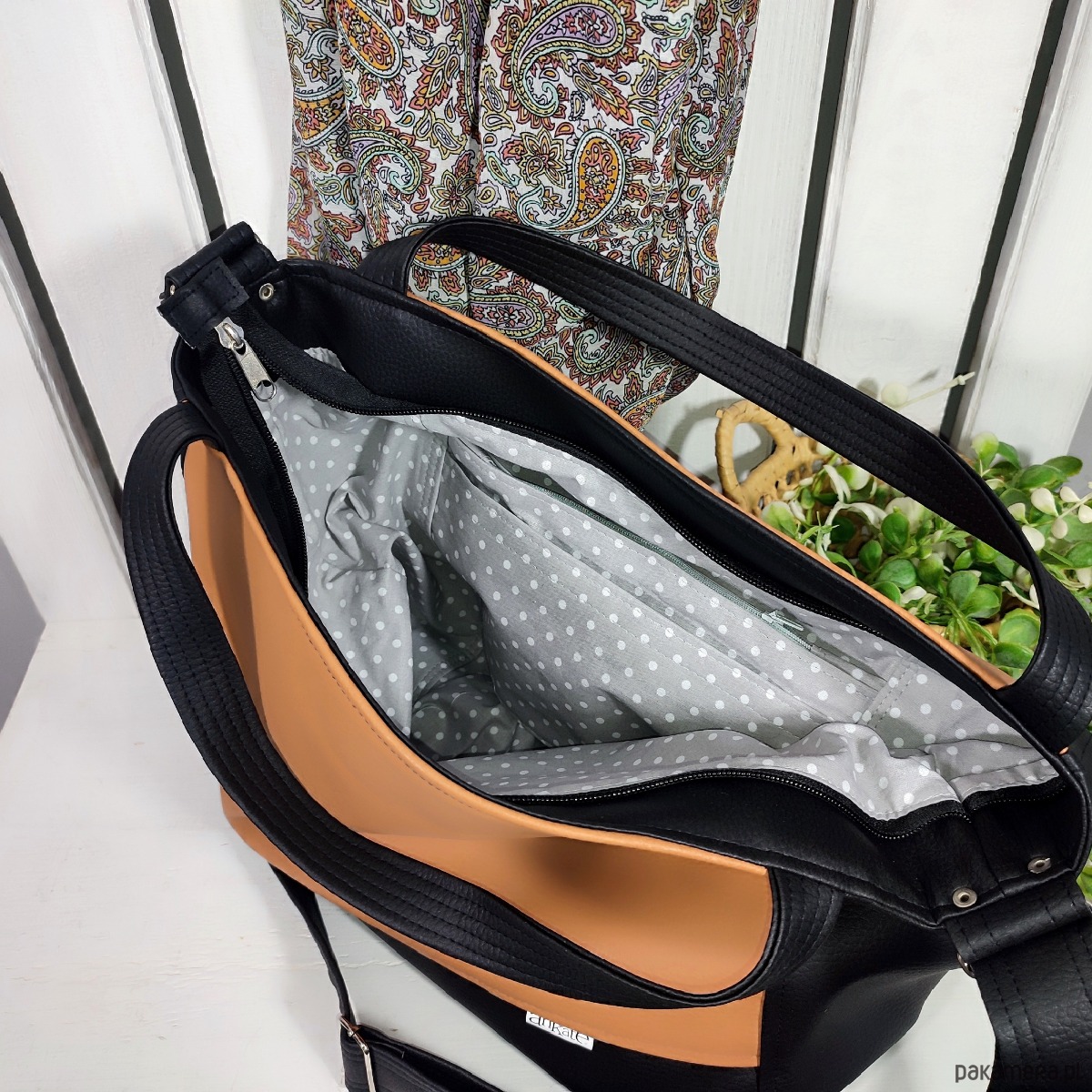 estetyczne wykończenie, zapięcie na suwak, wewnątrz bawełniana podszewka z 3 kieszonkami, jedna z nich zapinana na zamek, z tyłu dodatkowa, zapinana na suwak kieszeń podręczna, 100% handmade.