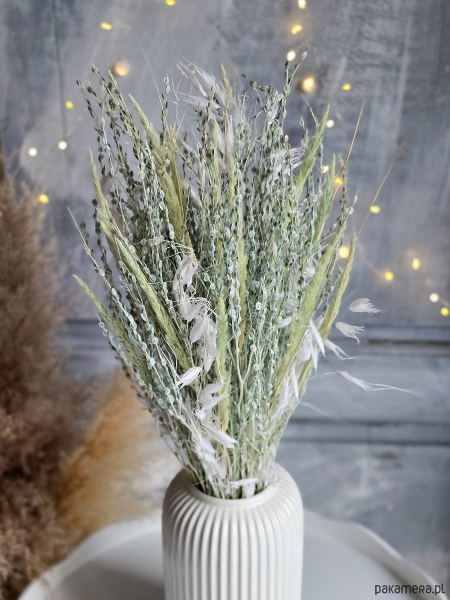 Bukiet z suszonych kwiatów to trwała dekoracja wnętrza, którą możesz ustawić w wazonie na stole, komodzie lub konsoli. Nie wymaga podlewania i przez długi czas zachowuje swój wygląd.