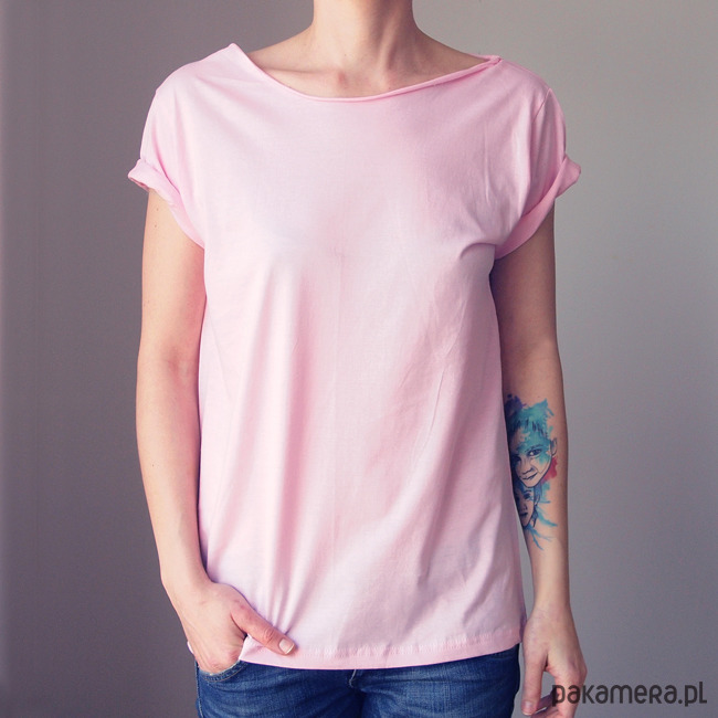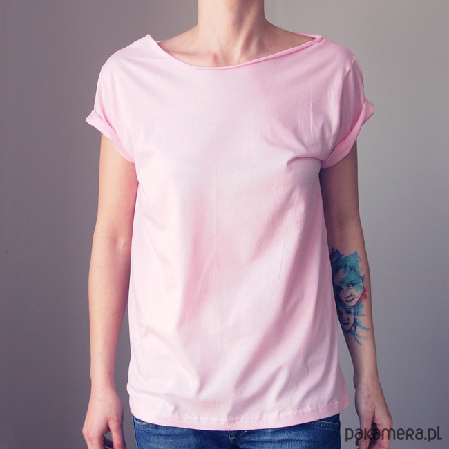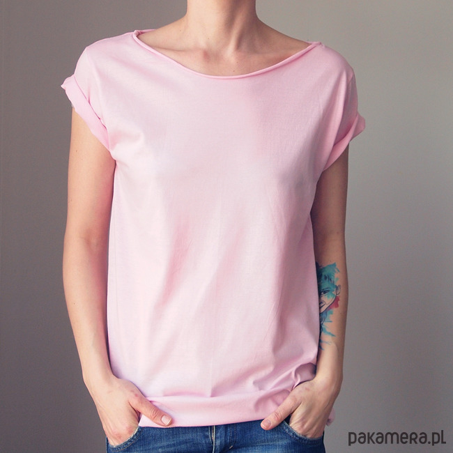 Jasnoróżowy, niebanalny tshirt z opadającym dekoltem.