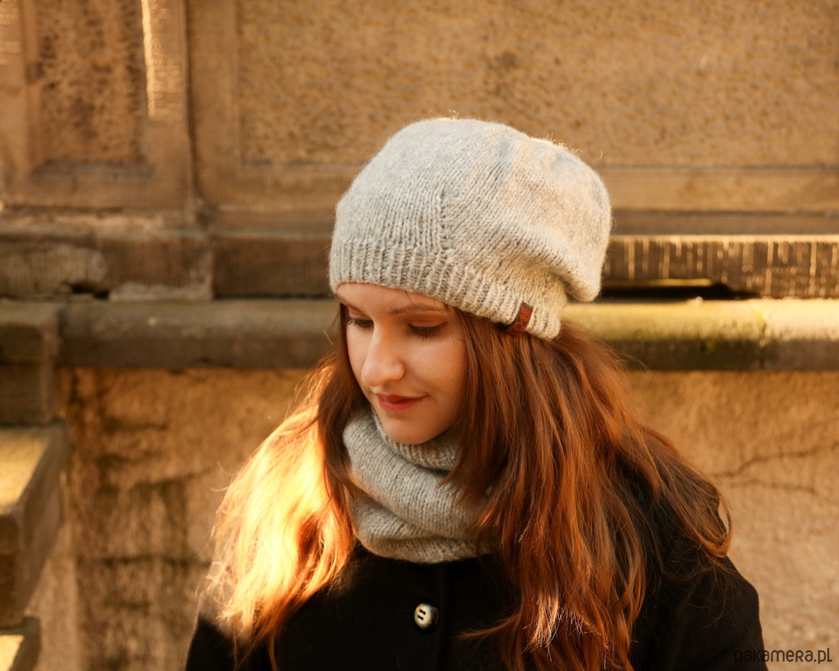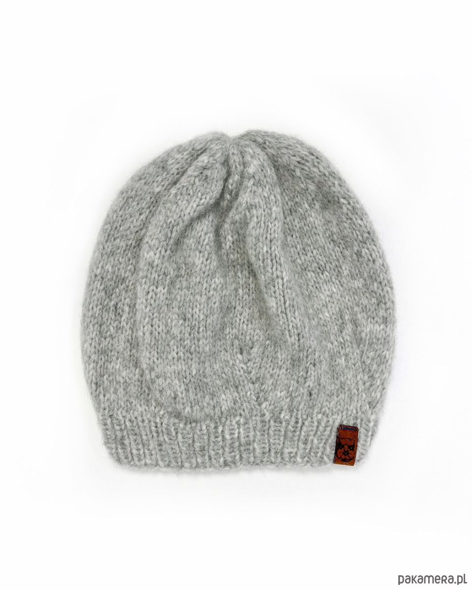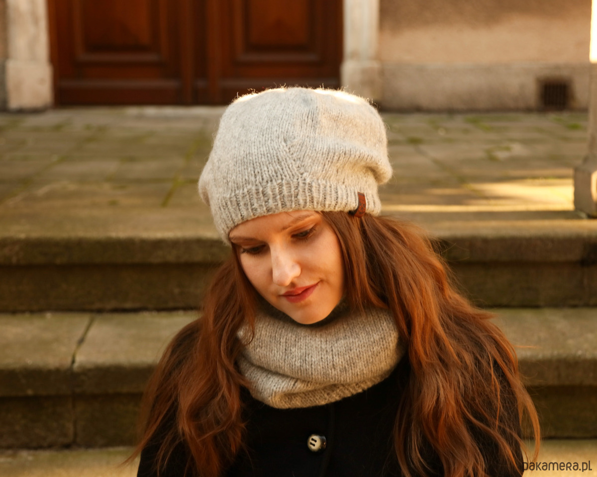 Jasnoszara czapka z alpaki należy do kolekcji lekkich jak piórko czapek beretowych, które nie zrujnują Twojej fryzury. Wszystkie czapki z tej serii są bardzo twarzowe, gdyż możesz „modelować” je, układając i nosząc na różne sposoby. Zaprojektowałam je nieco na kształt beretu. To oznacza, że przylegają przy twarzy, nie zsuwając się z głowy, a ich pozostała część się rozszerza. Szerszą część możesz uformować z tyłu lub zawadiacko przekręcić na bok.