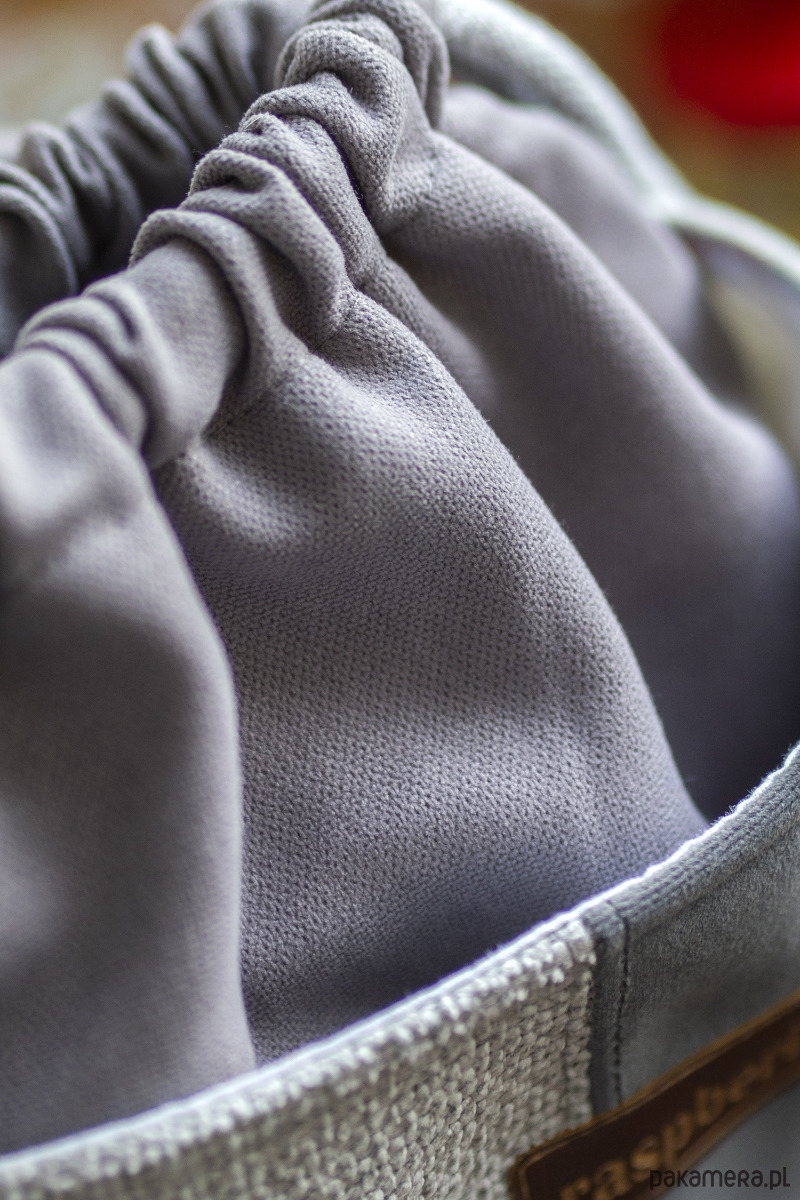 Całość ściągana grubym, bawełnianym sznurkiem w kolorze jasnoszarym.