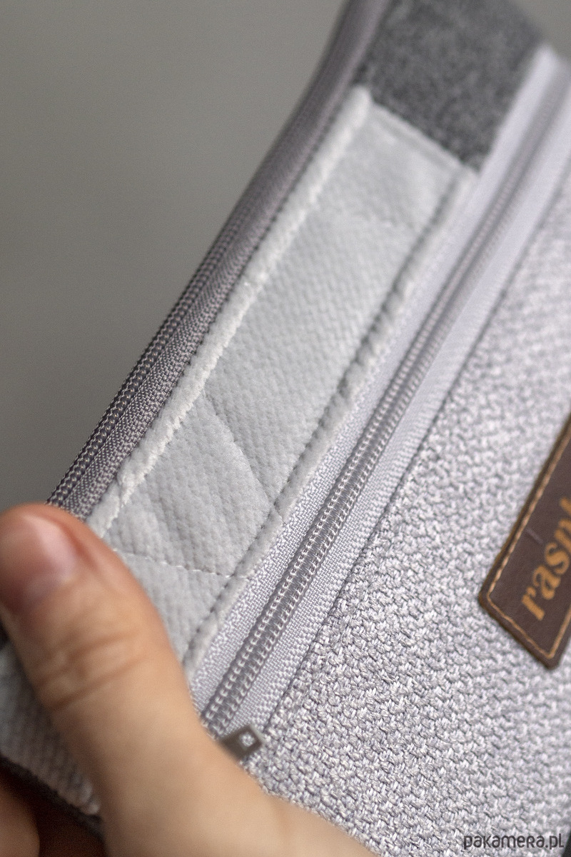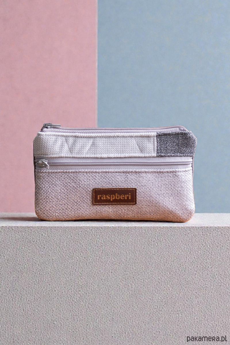 Prosty wodoodporny portfel wykonany z kilku rodzajów tkanin w odcieniach szarości. Unikatowy, jedyny egzemplarz.