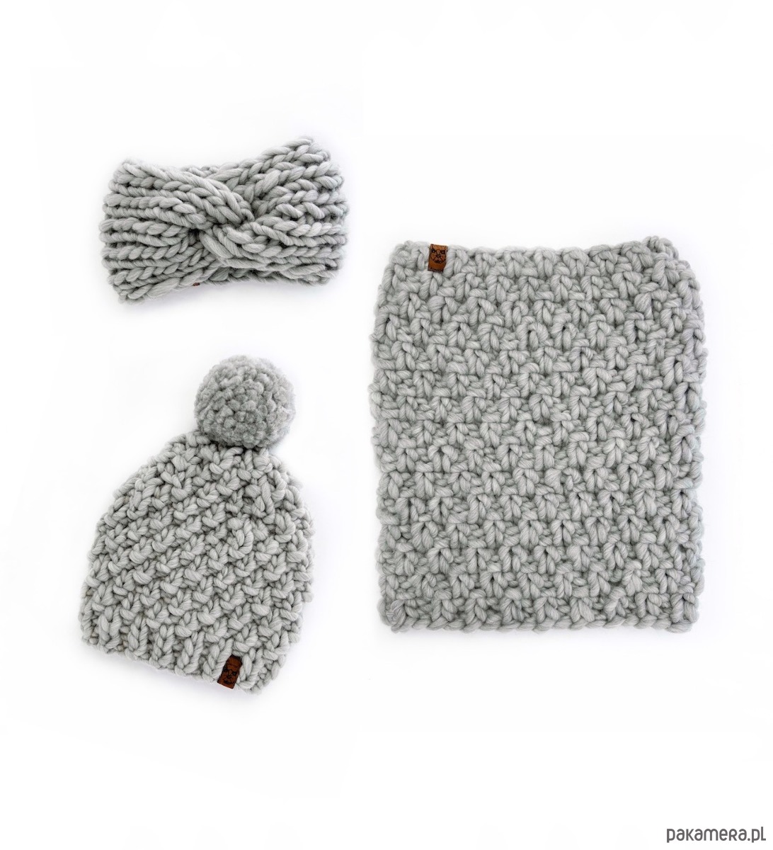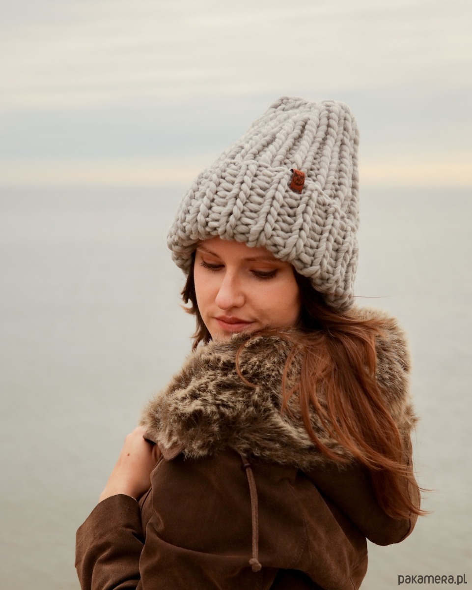 Stwórz komplet z: czapką z pomponem lub opaską-turbanem z szarej grubej wełny.