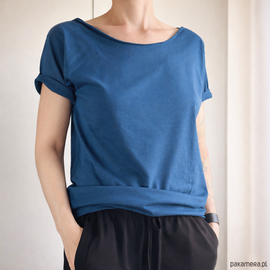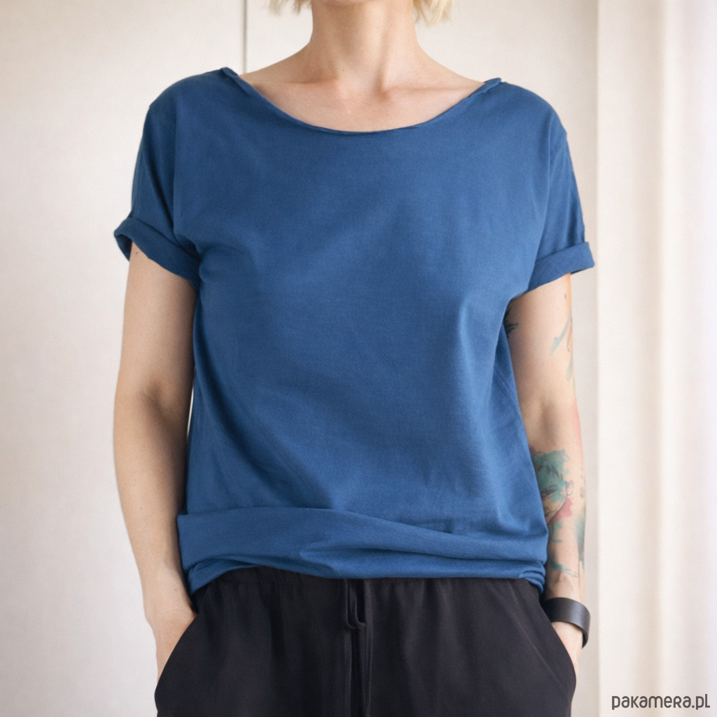 Nieoczywisty odcień, jasnogranatowy tshirt. Różni się od naszych klasycznych granatów, jest jaśniejszy i cieplejszy, bardzo fajny.