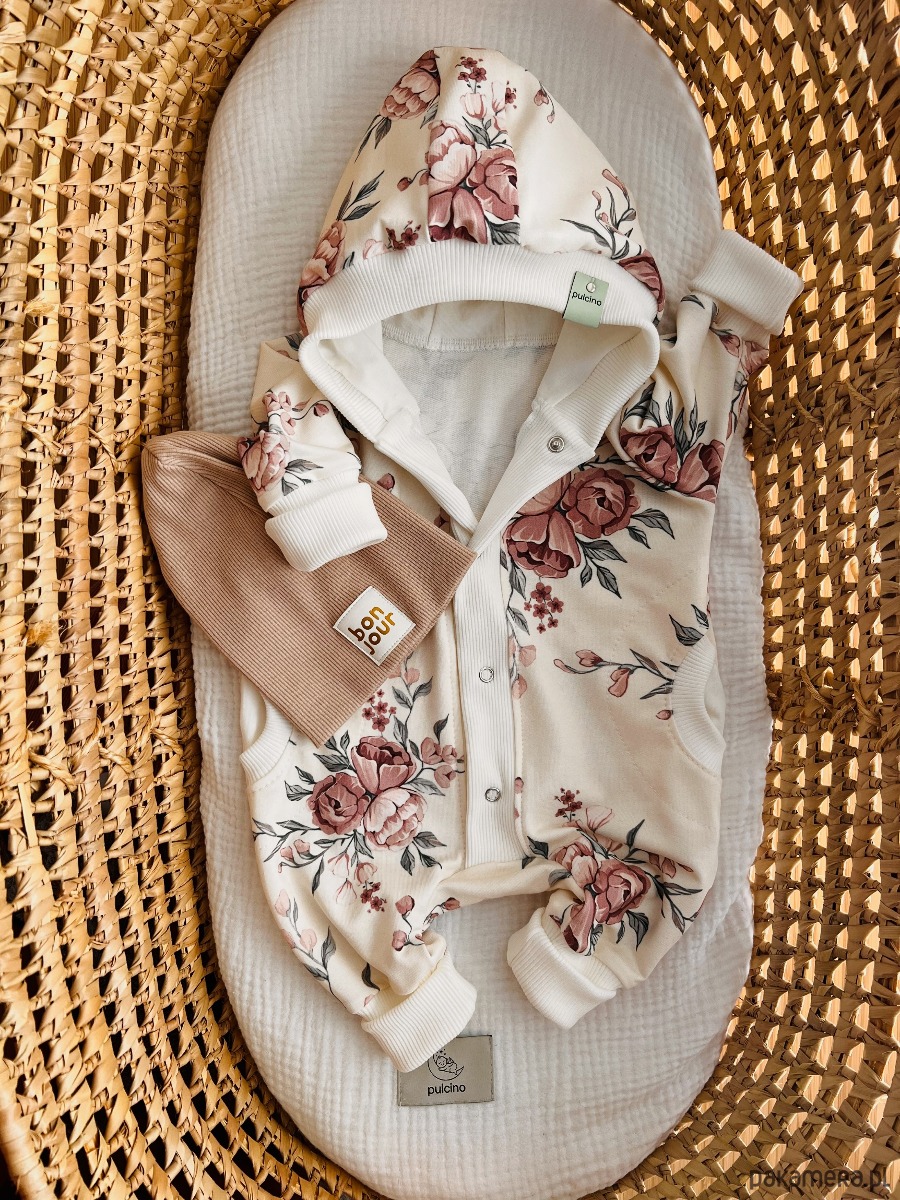 Nasz bestseller sklepowy-kombinezon uszyty z mięciutkiej dzianiny dresowej, w najwyższej klasie materiałów, który rośnie razem z maluchem. Specjalnie zaprojektowane ściągacze przy nogawkach i rękawkach można dowolnie podwijać i odwijać dodając ubranku długości. Obszerny kaptur został uszyty z dwóch warstw materiału, co dodatkowo chroni główkę przed utratą ciepła, bez problemu pomieści również każdą czapeczkę gdy szykujecie się na spacer. Kombinezon jest zaprojektowany w stylu oversize, jego luźny krój daje maluszkowi komfort i nie krępuje jego ruchów. Możesz go zakładać bezpośrednio na ciało lub jako drugą warstwę odzieży. Zapinany za pomocą bezniklowych nap, nie uwiera i nie drażni skóry maluszka. Bardzo łatwy w zakładaniu, co doceni każdy rodzic. Okrągłe kieszenie wykończone ściągaczem dodają ubranku uroku.