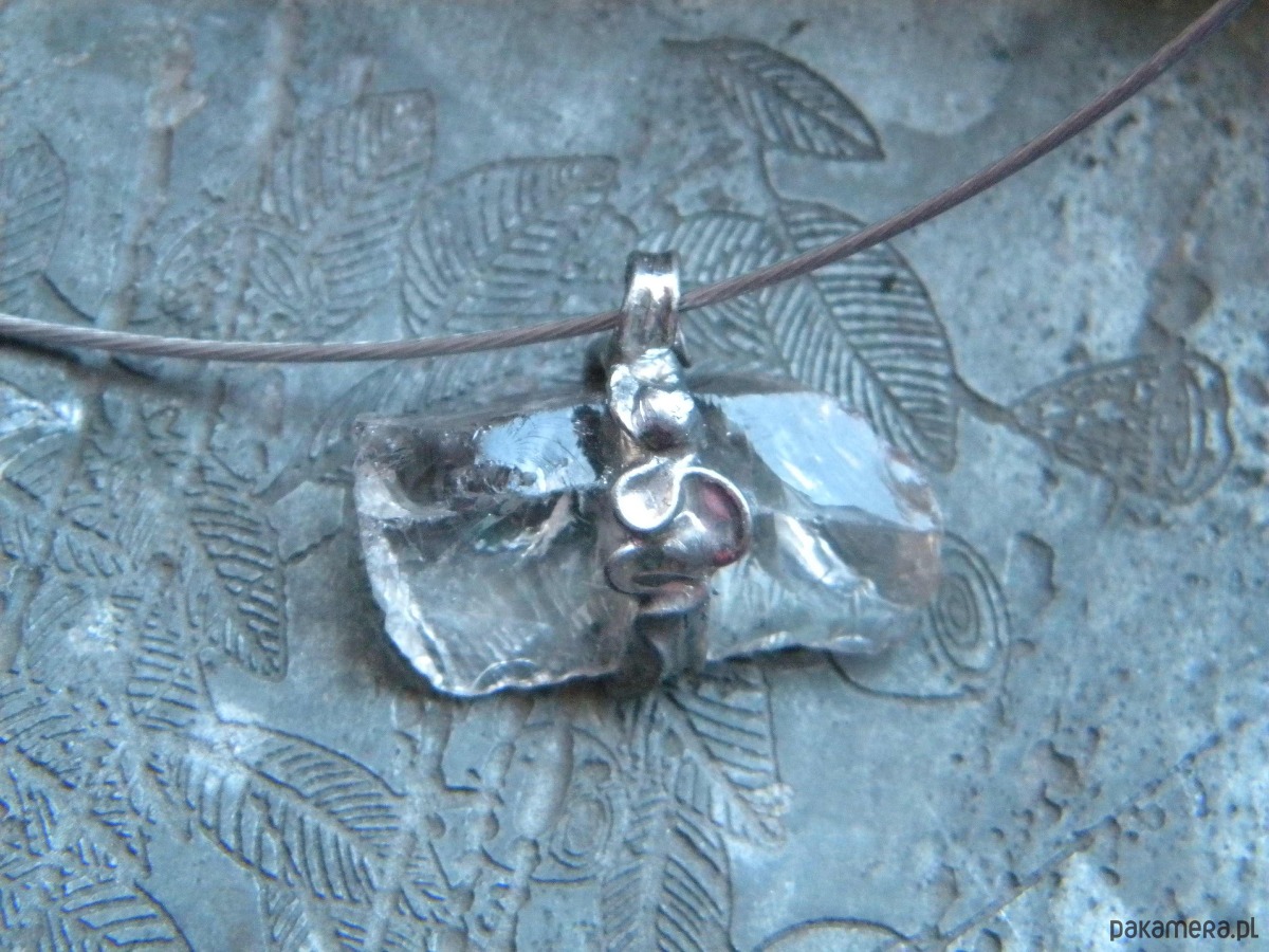 surowy kwarc dymny oprawiony w ocynowaną miedz.