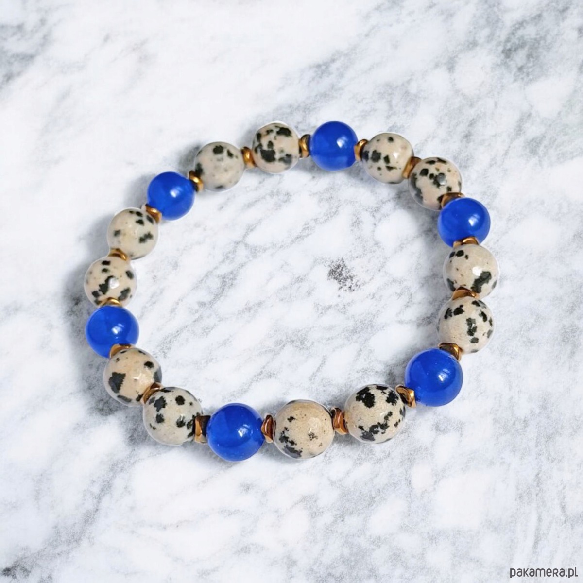 Kolorowa i niepoważna bransoletka na solidnej lince elastycznej, wykonana z fasetowanego jaspisu dalmatyńskiego (ok. 8mm) oraz soczystego jadeitu (chabrowy niebieski) i przekładek ze złotego hematytu.