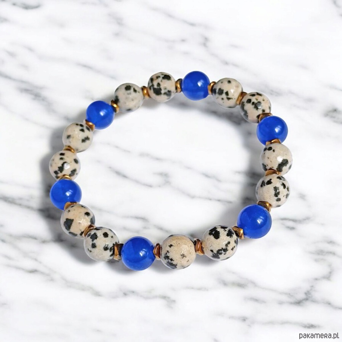Kolorowa i niepoważna bransoletka na solidnej lince elastycznej, wykonana z fasetowanego jaspisu dalmatyńskiego (ok. 8mm) oraz soczystego jadeitu (chabrowy niebieski) i przekładek ze złotego hematytu.
