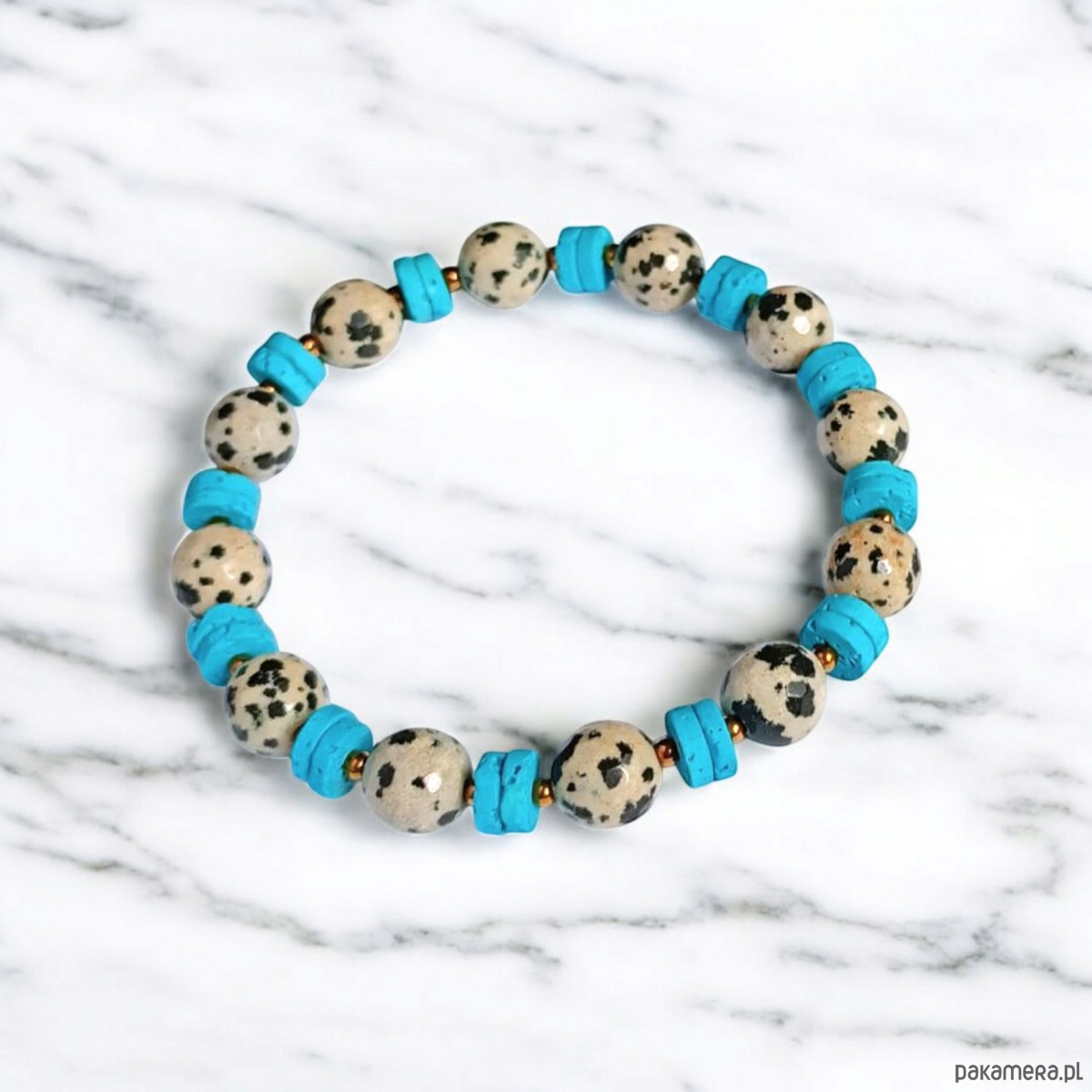 Kolorowa i niepoważna bransoletka na solidnej lince elastycznej, wykonana z fasetowanego jaspisu dalmatyńskiego (ok. 9mm) oraz turkusowej, porowatej lawy i przekładek ze złotego hematytu.