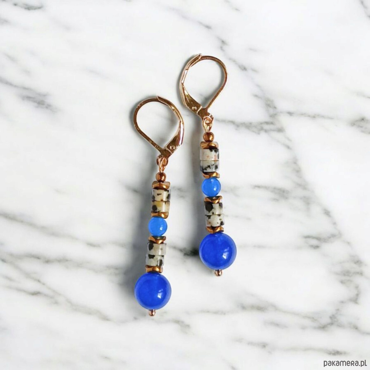 Kolorowe i niepoważne kolczyki wykonane z jaspisu dalmatyńskiego (ok. 4mm) oraz soczystego jadeitu (chabrowy niebieski) 4 i 8mm, przekładek ze złotego hematytu.