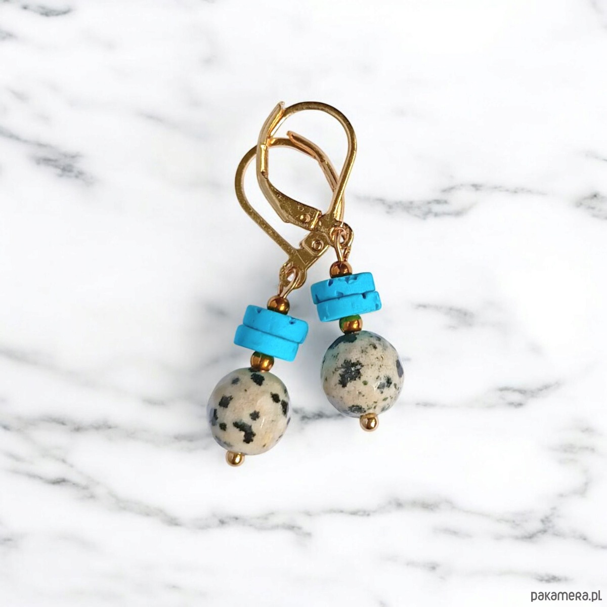 Kolorowe i niepoważne kolczyki wykonane z fasetowanego jaspisu dalmatyńskiego (ok. 9mm) oraz turkusowej, porowatej lawy i przekładek ze złotego hematytu.