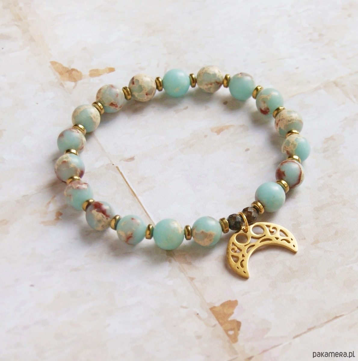 wykonana z kul jaspisu cesarskiego8mm, przekładek ze złotego hematytu, ażurowej zawieszki z pozłacanej stali szlachetnej (nie uczula!) i 2 kuleczek fasetowanego bronzytu.