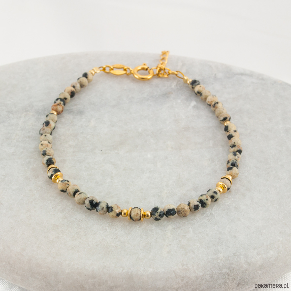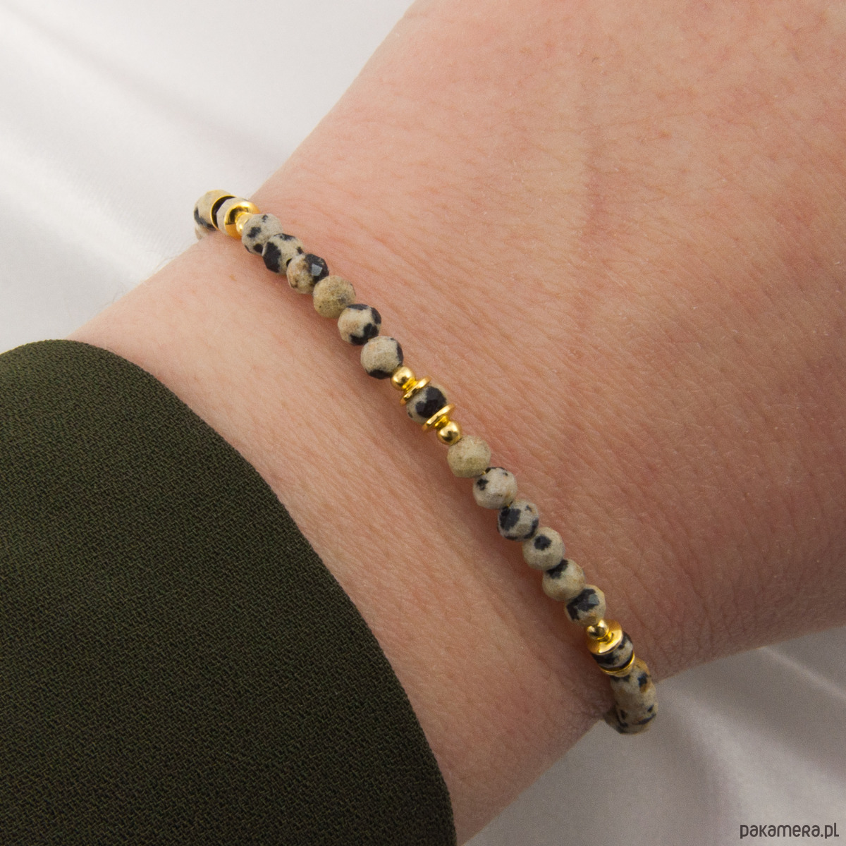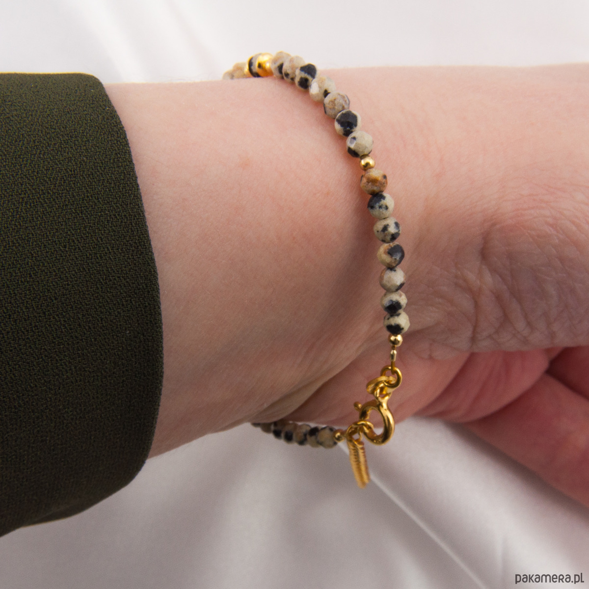 Ręcznie wykonana bransoletka z naturalnym jaspisem dalmatyńskim – kamieniem wspierającym radość życia, odwagę i pozytywne nastawienie. Charakterystyczne, nakrapiane wzory sprawiają, że każda bransoletka jest absolutnie unikalna. Jaspis dalmatyński znany jest również ze swoich właściwości ochronnych – pomaga odsuwać negatywne emocje i wspiera w podejmowaniu decyzji. Subtelny, minimalistyczny design sprawia, że pasuje do codziennych i wyjątkowych stylizacji. Idealna na prezent lub jako osobisty talizman.