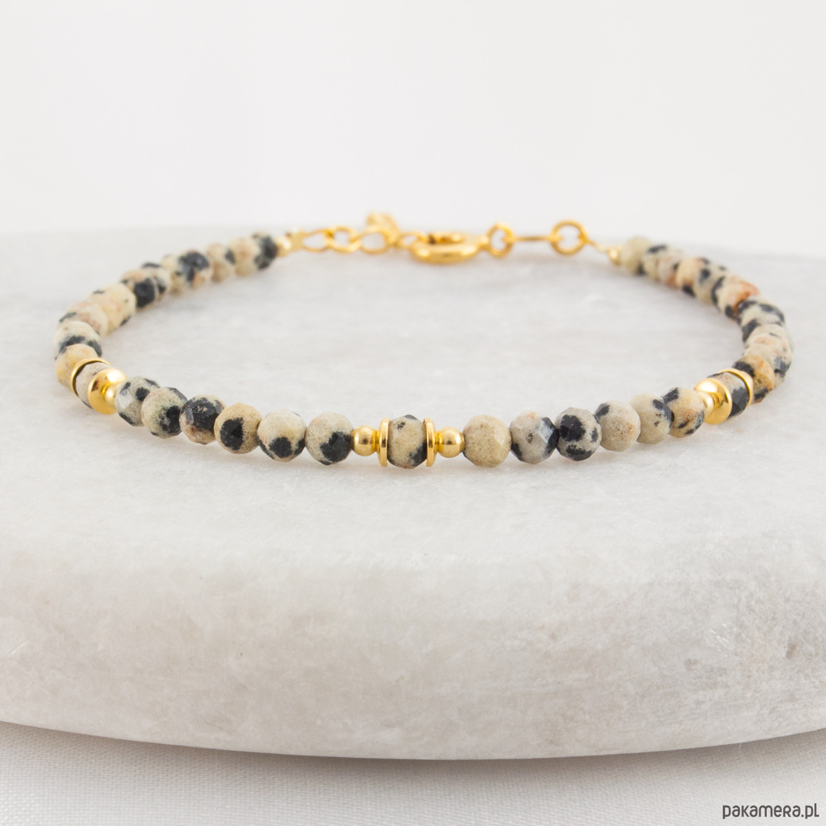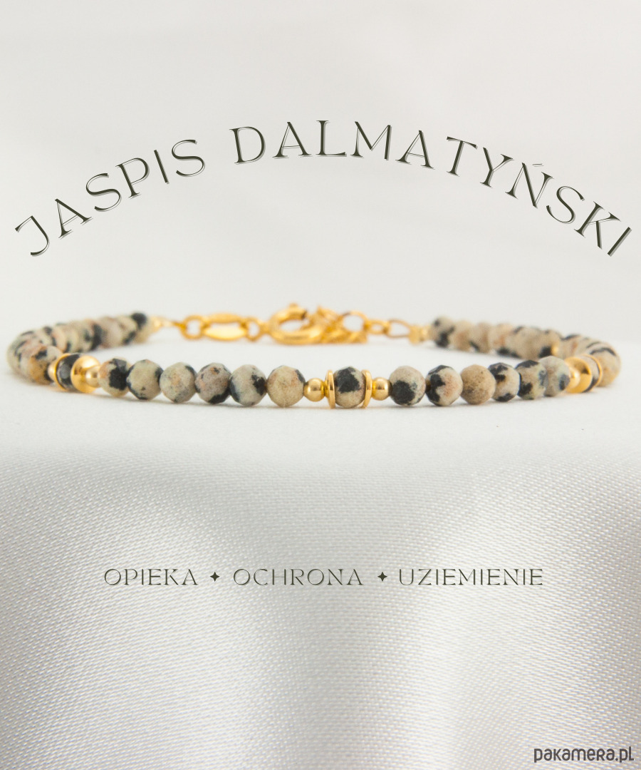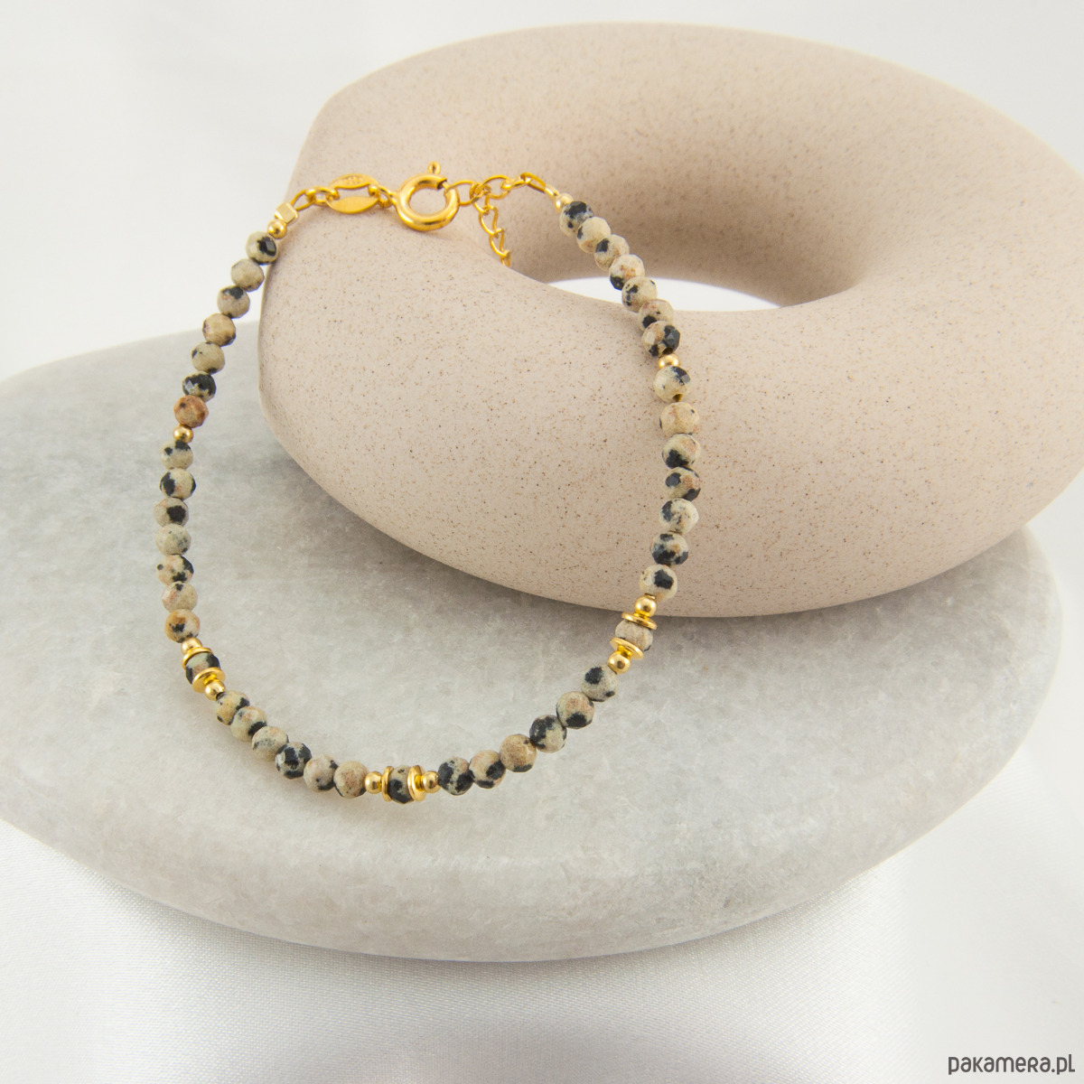 Ręcznie wykonana bransoletka z naturalnym jaspisem dalmatyńskim – kamieniem wspierającym radość życia, odwagę i pozytywne nastawienie. Charakterystyczne, nakrapiane wzory sprawiają, że każda bransoletka jest absolutnie unikalna. Jaspis dalmatyński znany jest również ze swoich właściwości ochronnych – pomaga odsuwać negatywne emocje i wspiera w podejmowaniu decyzji. Subtelny, minimalistyczny design sprawia, że pasuje do codziennych i wyjątkowych stylizacji. Idealna na prezent lub jako osobisty talizman.