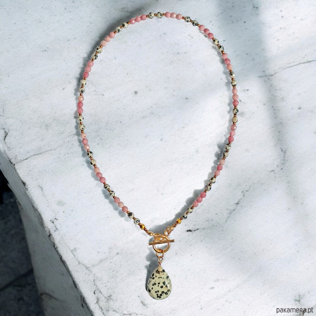 Piękny naszyjnik wykonany z połączenia jaspisu dalmatyńskiego i fasetowanego rodonitu w odcieniach zgaszonego różu (4mm) oraz drobniutkich kuleczek złotego hematytu 2mm.