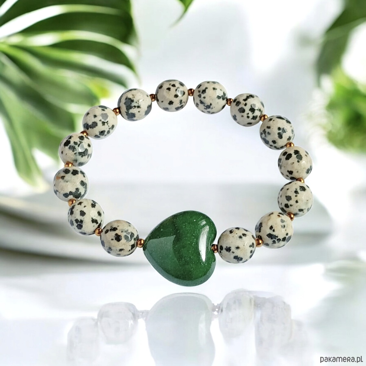 Jaspis dalmatyński i serce : ciemna zieleń : bransoletka na gumce