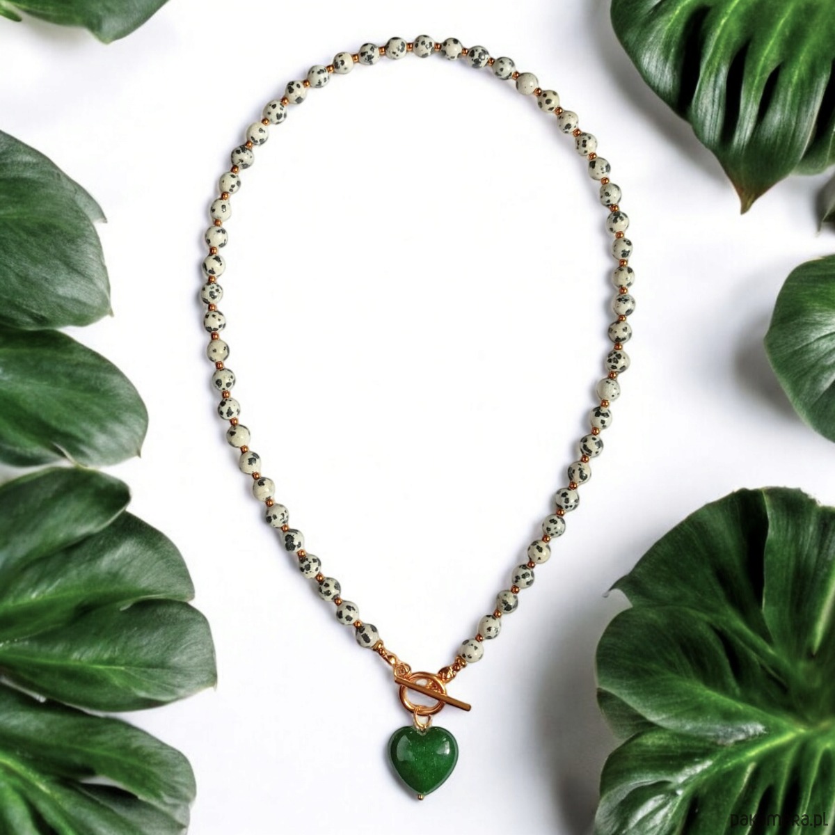 Piękny naszyjnik wykonany z połączenia jaspisu dalmatyńskiego 6mm oraz drobniutkich kuleczek złotego hematytu 2mm i kontrastującego serca z jadeitu (CIEMNA ZIELEŃ).