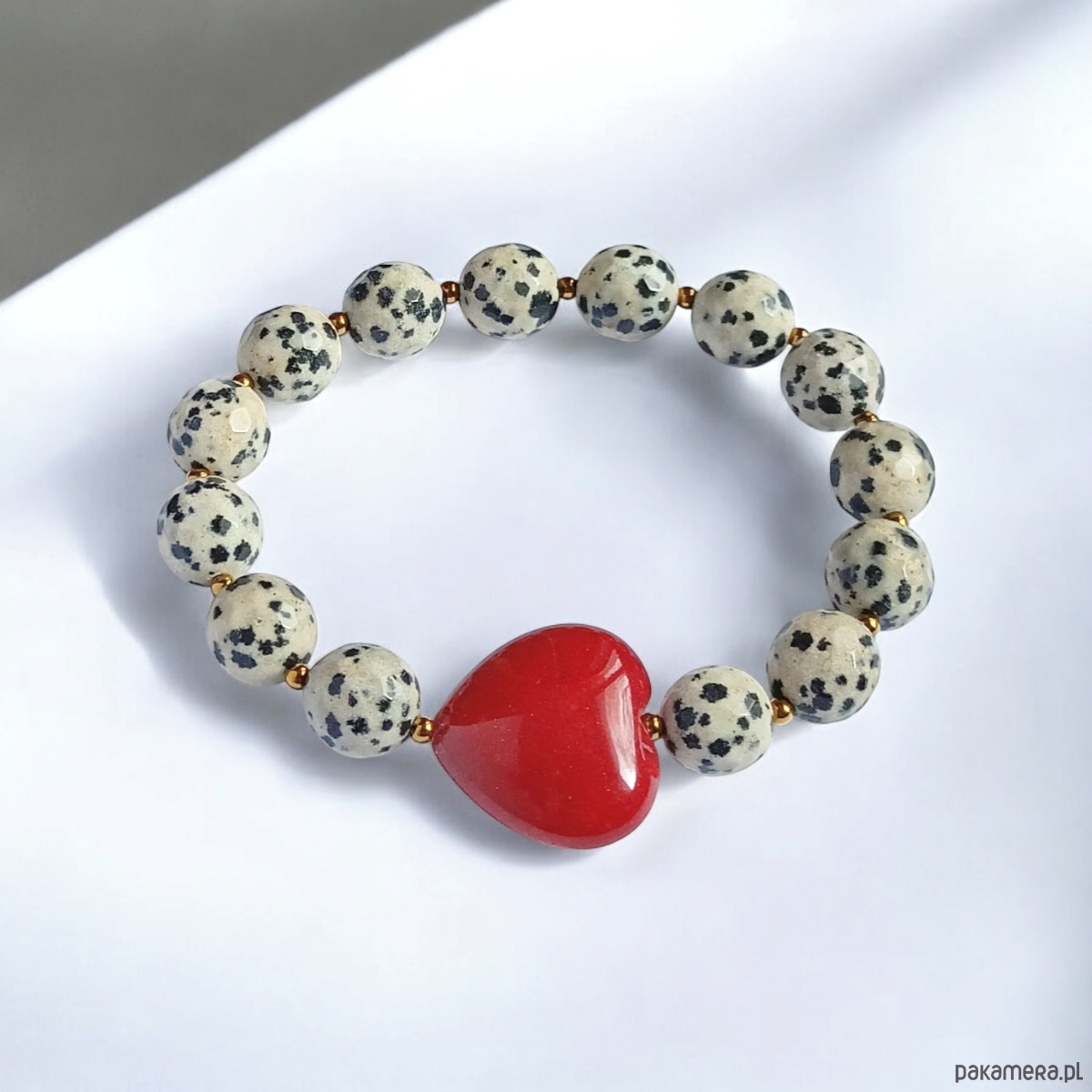 Jaspis dalmatyński i serce : CZERWIEŃ : bransoletka na gumce
