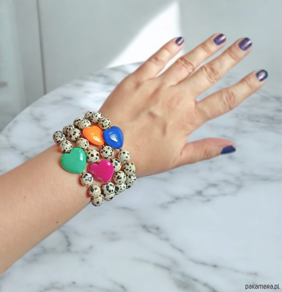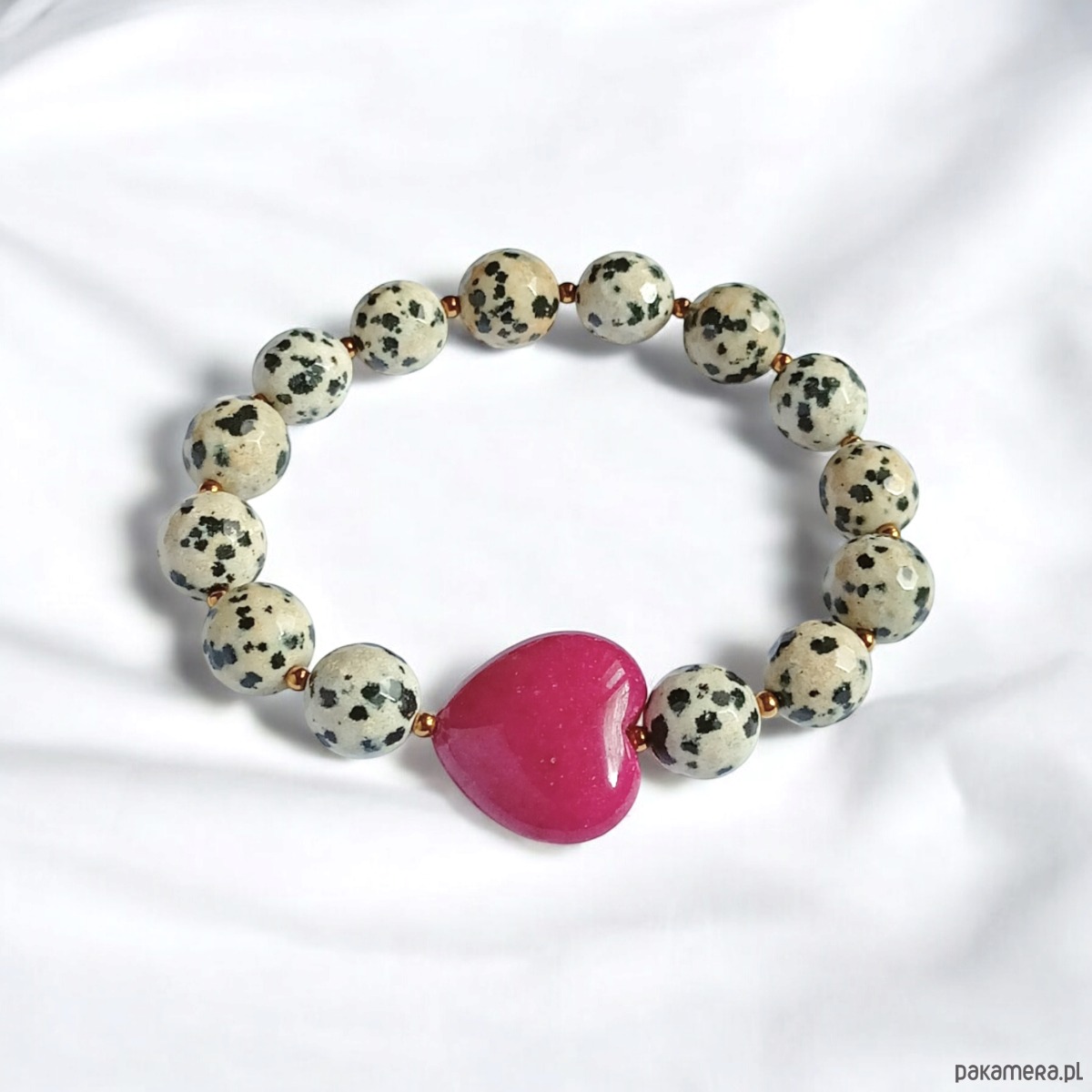 Jaspis dalmatyński i serce : FUKSJA : bransoletka na gumce