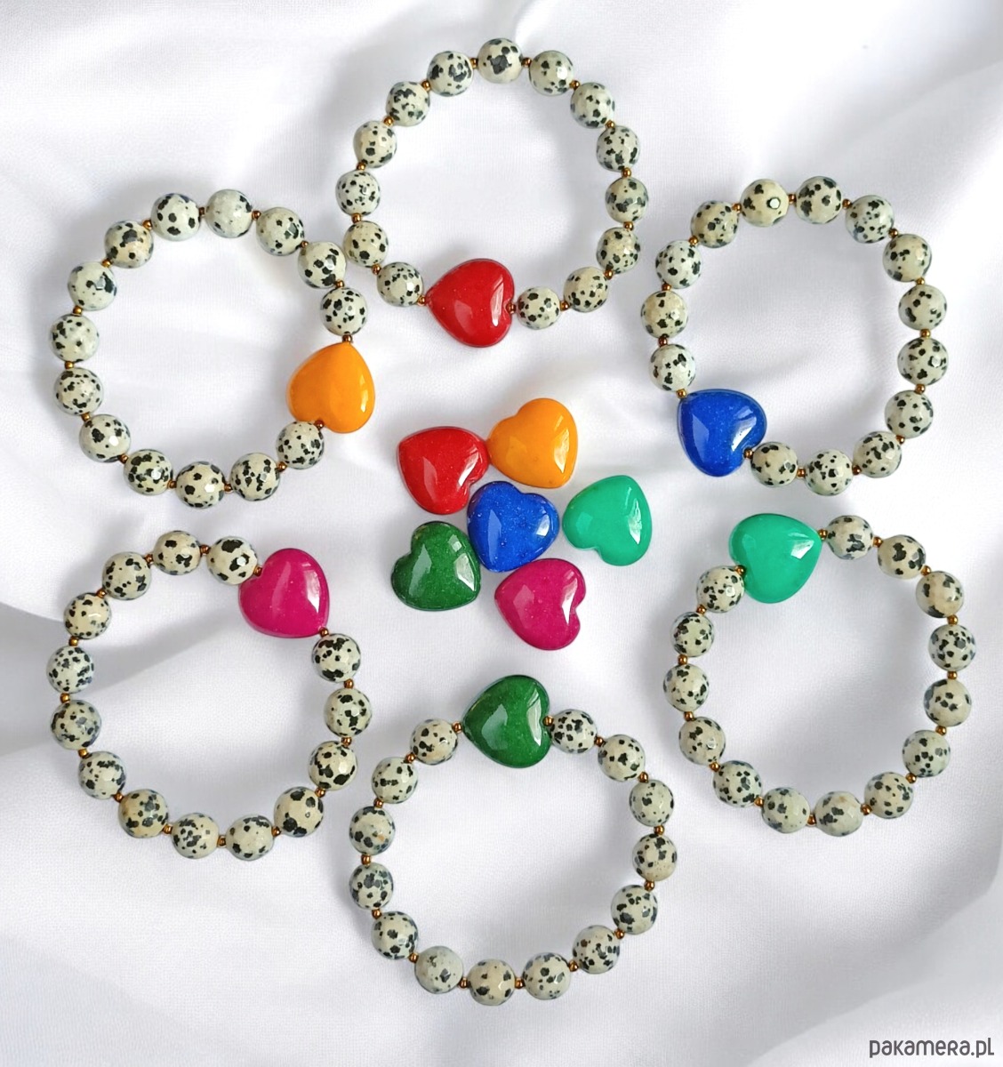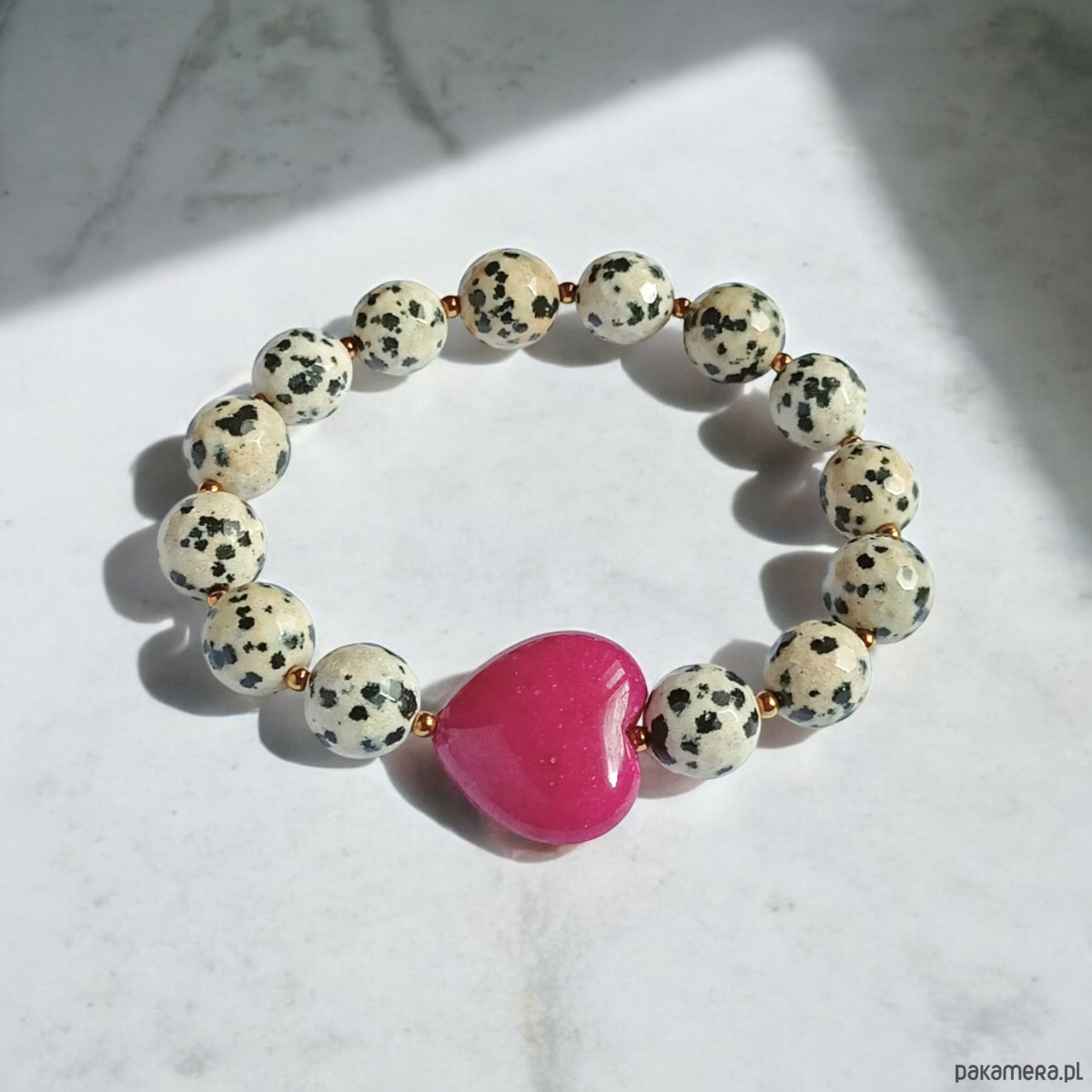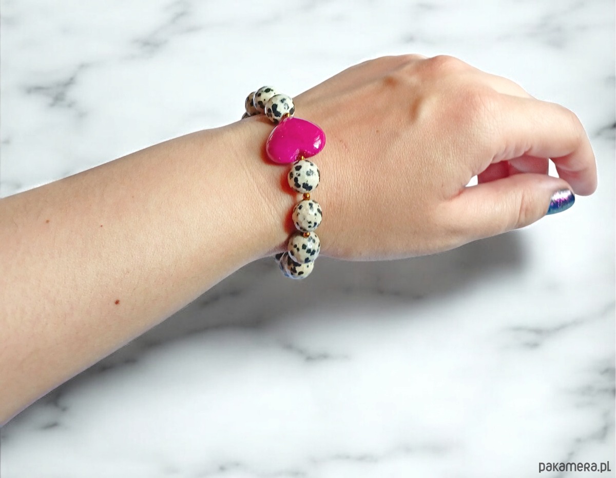 Jaspis dalmatyński i serce : FUKSJA : bransoletka na gumce