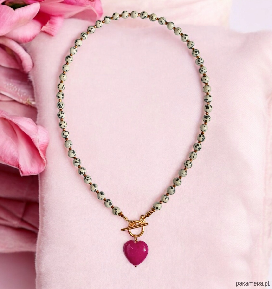 Jaspis dalmatyński i serce : fuksja : naszyjnik