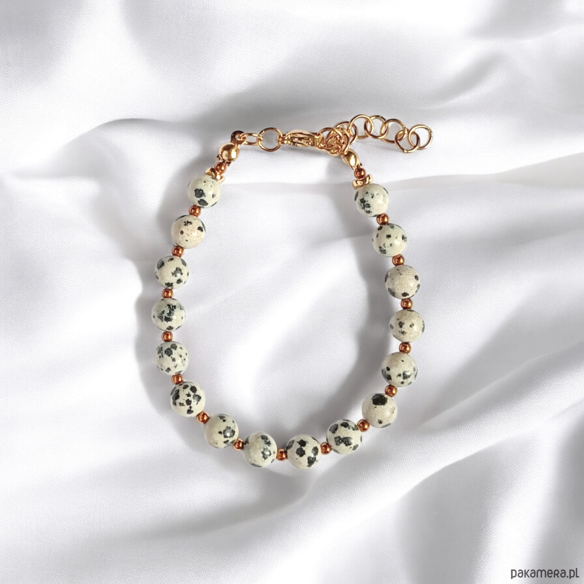 Wykonana z połączenia jaspisu dalmatyńskiego 6mm oraz drobniutkich kuleczek złotego hematytu 2mm.