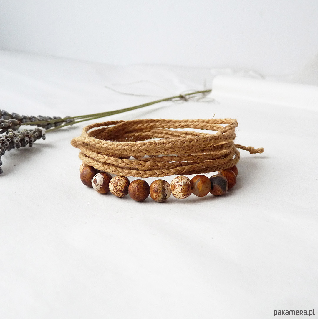 1. Wyplatana z lnianych nitek w kolorze orzechowym bransoletka wielowarstwowa (oplata nadgarstek 7-8 krotnie)