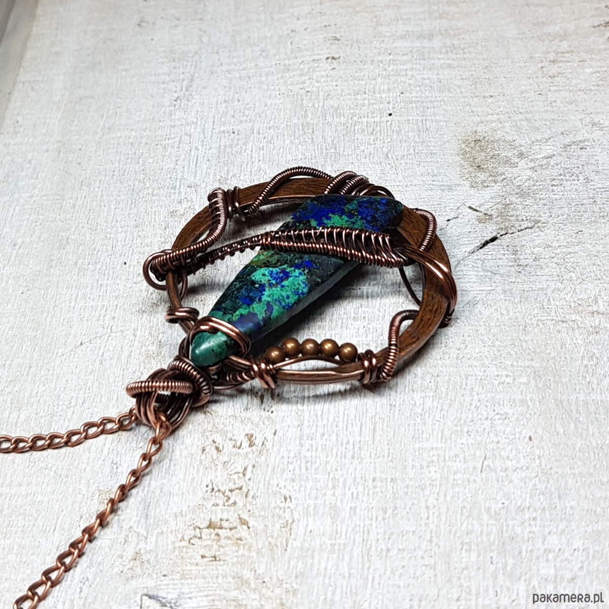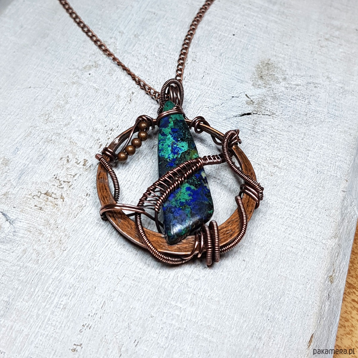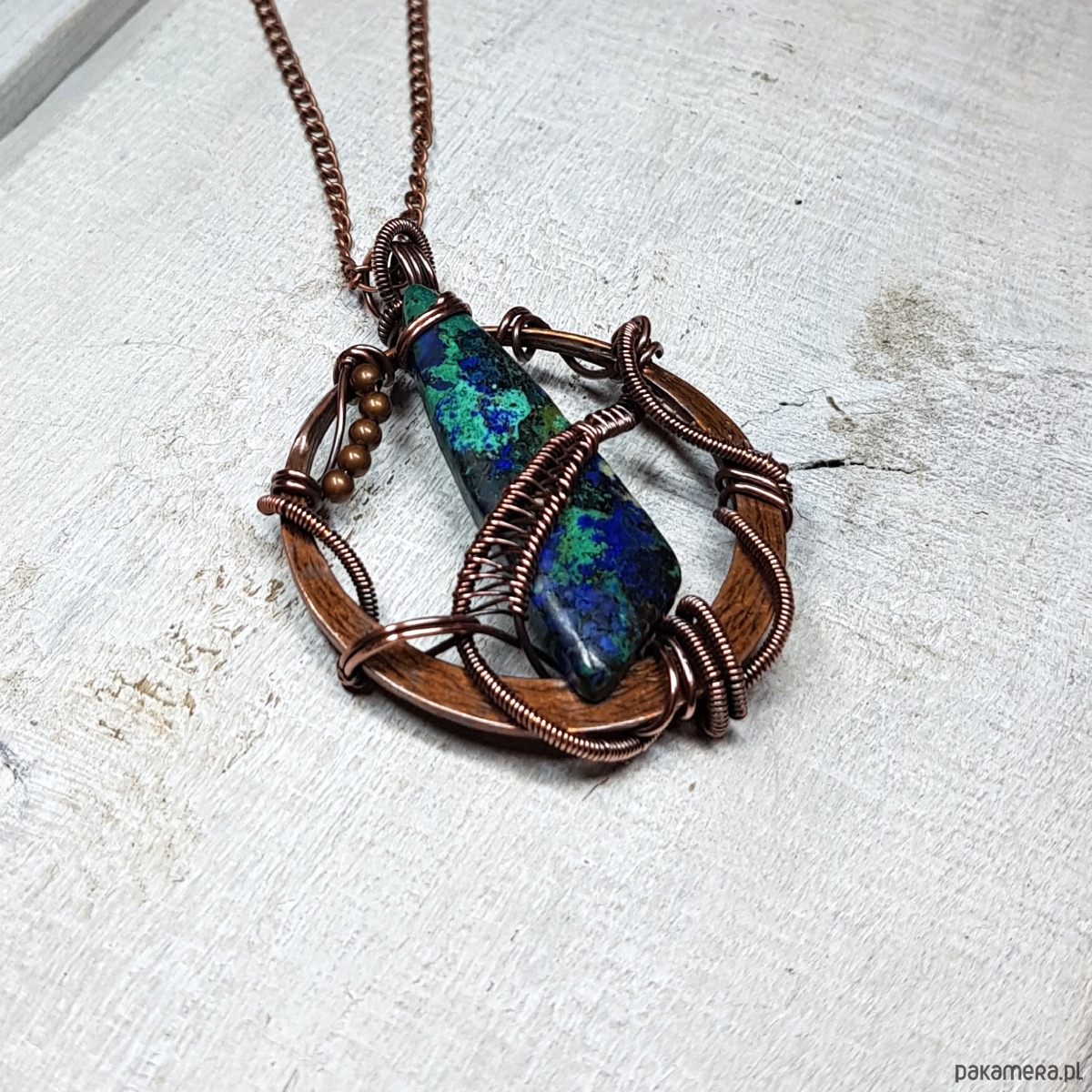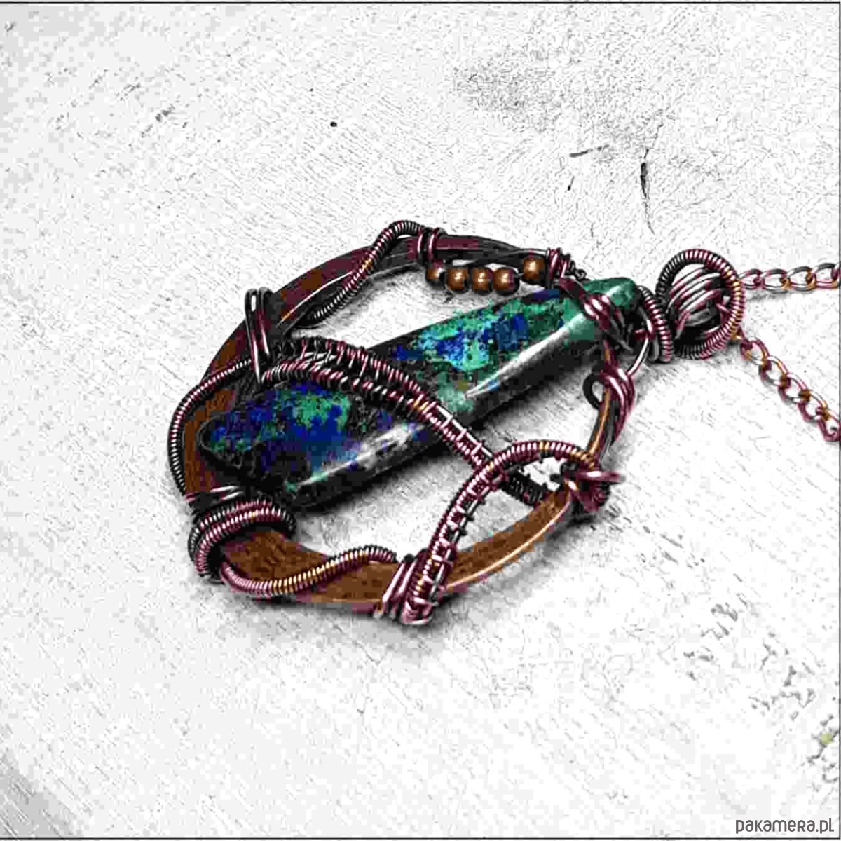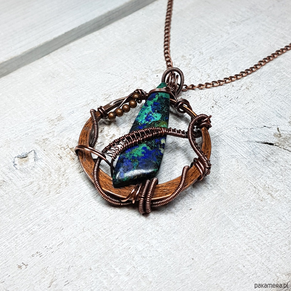 Zawieszka wykonana ręcznie metodą wire-wrappingu której głównym elementem jest jaspis w kolorze niebiesko-granatowym. Do wykonania wisiorka użyłam drutu miedzianego, który następnie zaoksydowałam i wypolerowałam w celu uzyskania efektu szlachetnego postarzenia. Wymiary zawieszki 58x43mm. Do zawieszki na życzenie mogę dołączyć gratis łańcuszek długości około 50 cm lub innej wg życzenia.