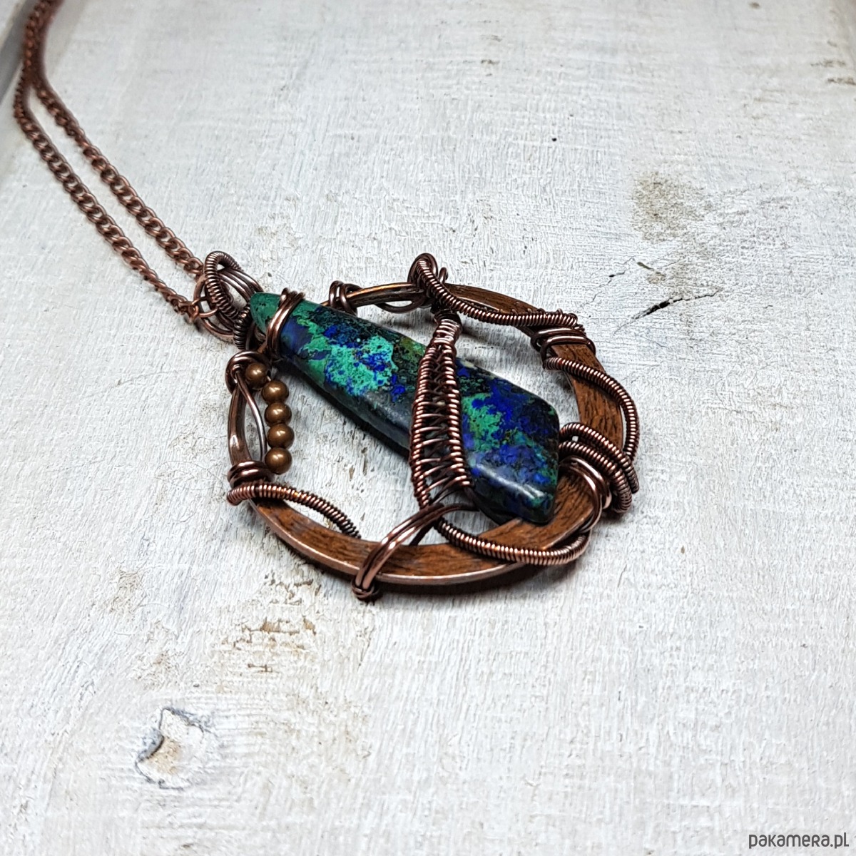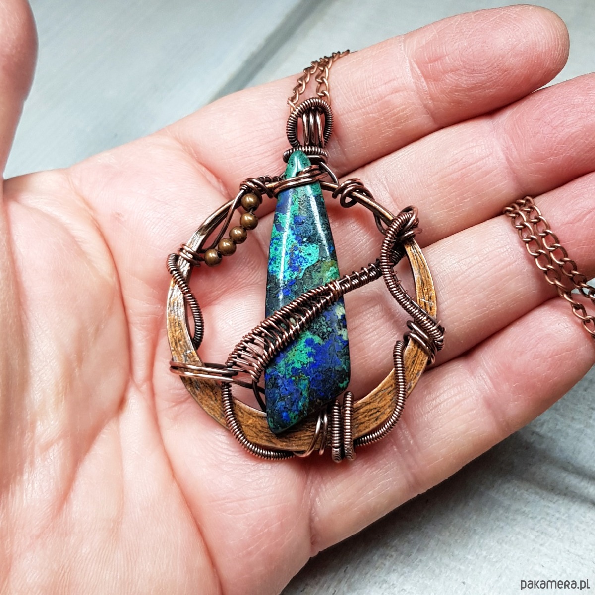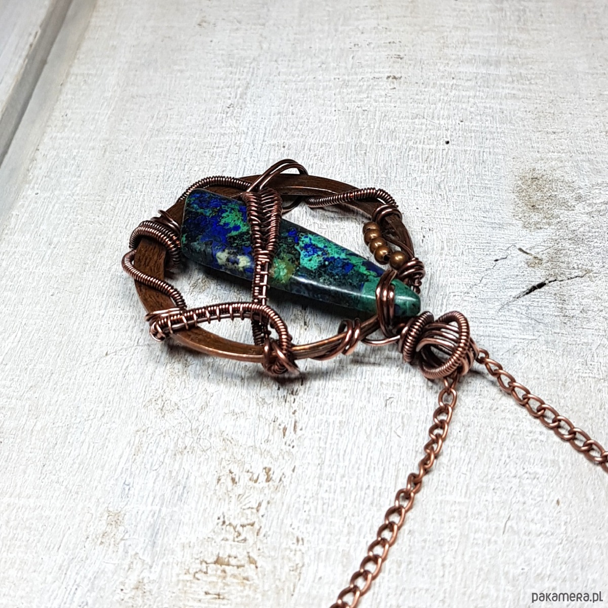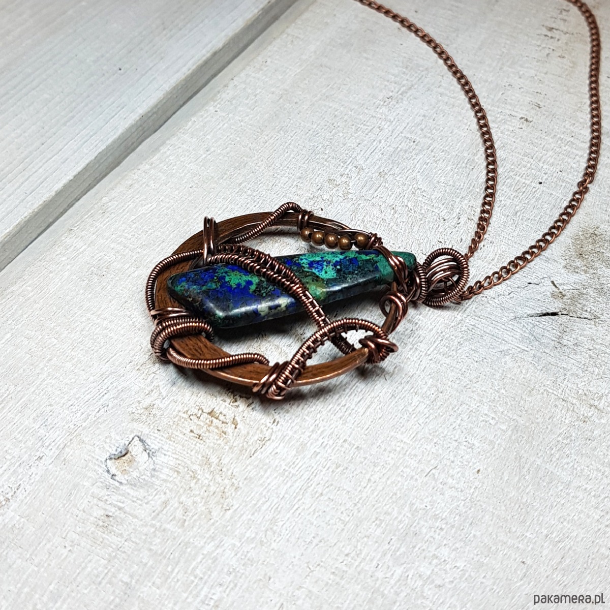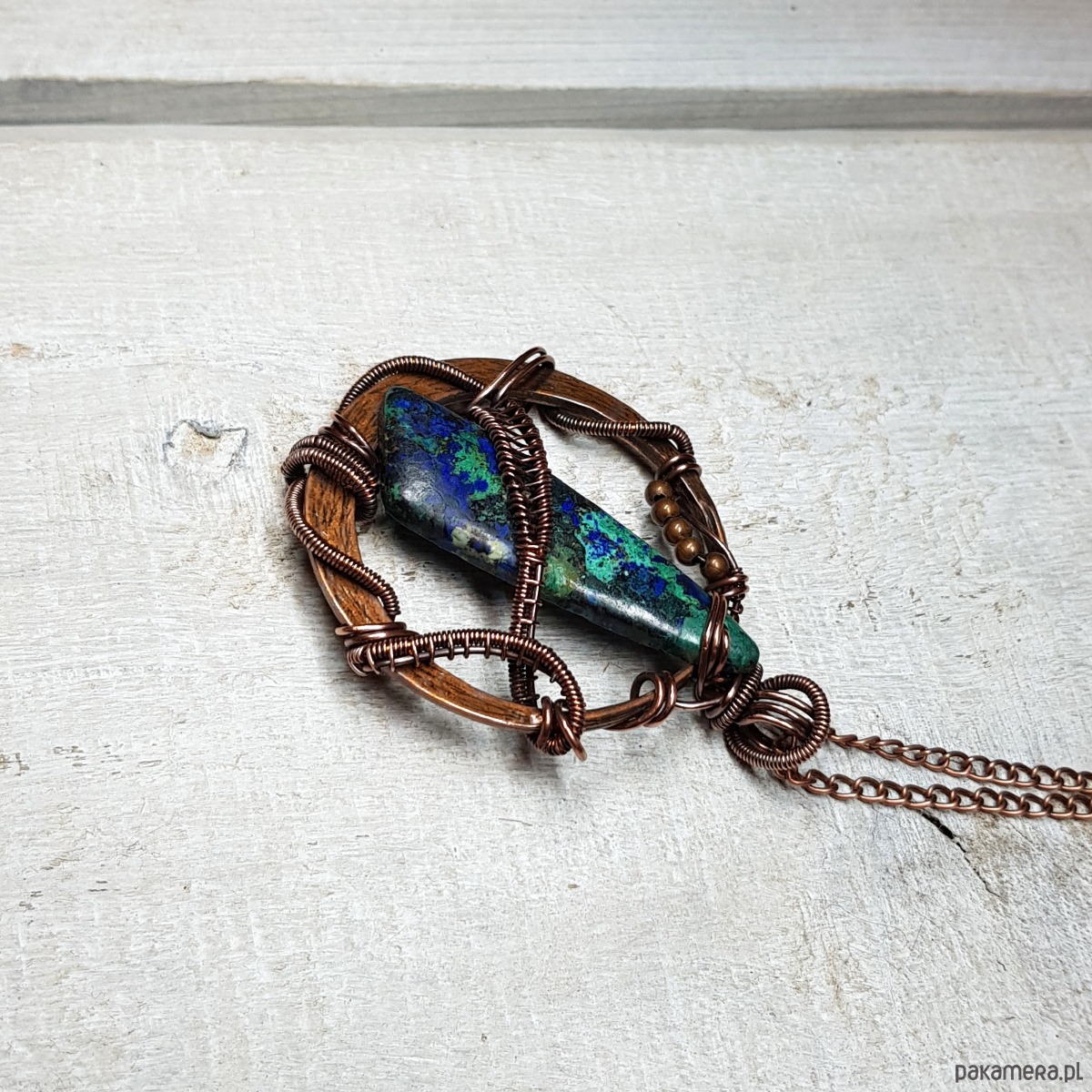 Zawieszka wykonana ręcznie metodą wire-wrappingu której głównym elementem jest jaspis w kolorze niebiesko-granatowym. Do wykonania wisiorka użyłam drutu miedzianego, który następnie zaoksydowałam i wypolerowałam w celu uzyskania efektu szlachetnego postarzenia. Wymiary zawieszki 58x43mm. Do zawieszki na życzenie mogę dołączyć gratis łańcuszek długości około 50 cm lub innej wg życzenia.