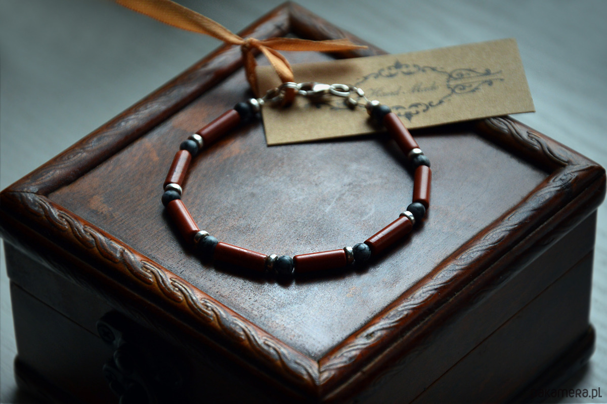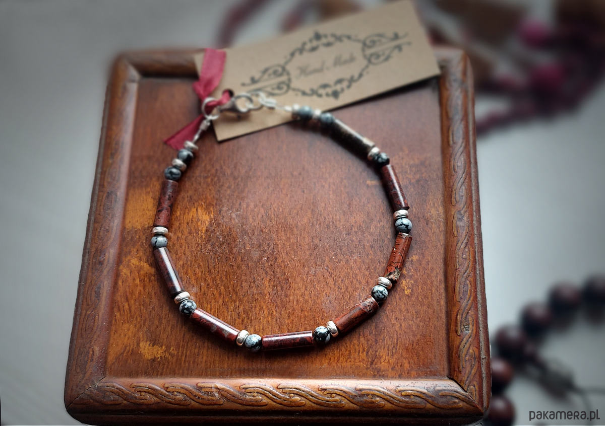 Bransoletka męska wykonana z wałeczków pięknego Jaspisu mahoniowego 4 mm x 13 mm oraz kuleczek 4 mm Obsydianu śnieżnego, poprzeplatana srebrnymi oponkami bez niklu.
