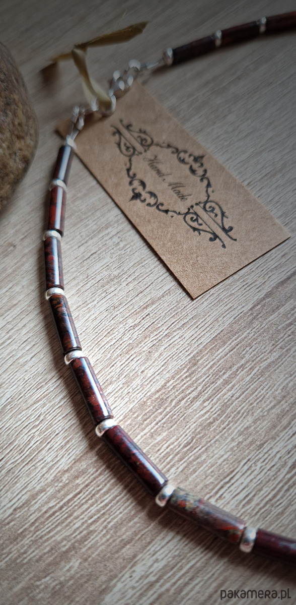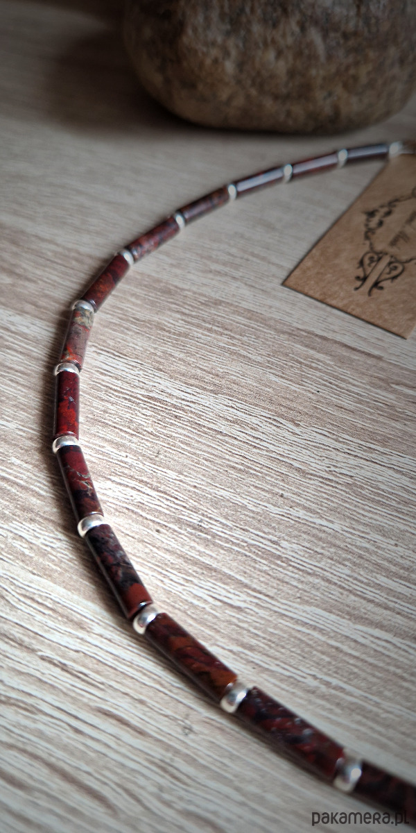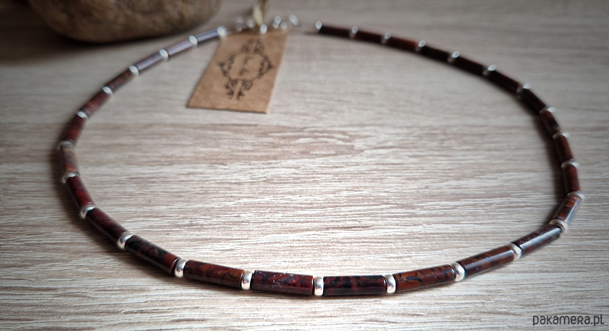 Naszyjnik autorski z kolekcji męskiej. Wykonany z wałeczków Jaspisu mahoniowego z Brazylii wielkości 13 mm x 4 mm, poprzeplatanego oponkami ze srebra 925 wolnego od niklu wielkości 4 mm. Całość na mocnym nośniku z linki jubilerskiej japońskiej. Wykończenie naszyjnika ze srebra 925 wolnego od niklu. Długość około 48 cm.