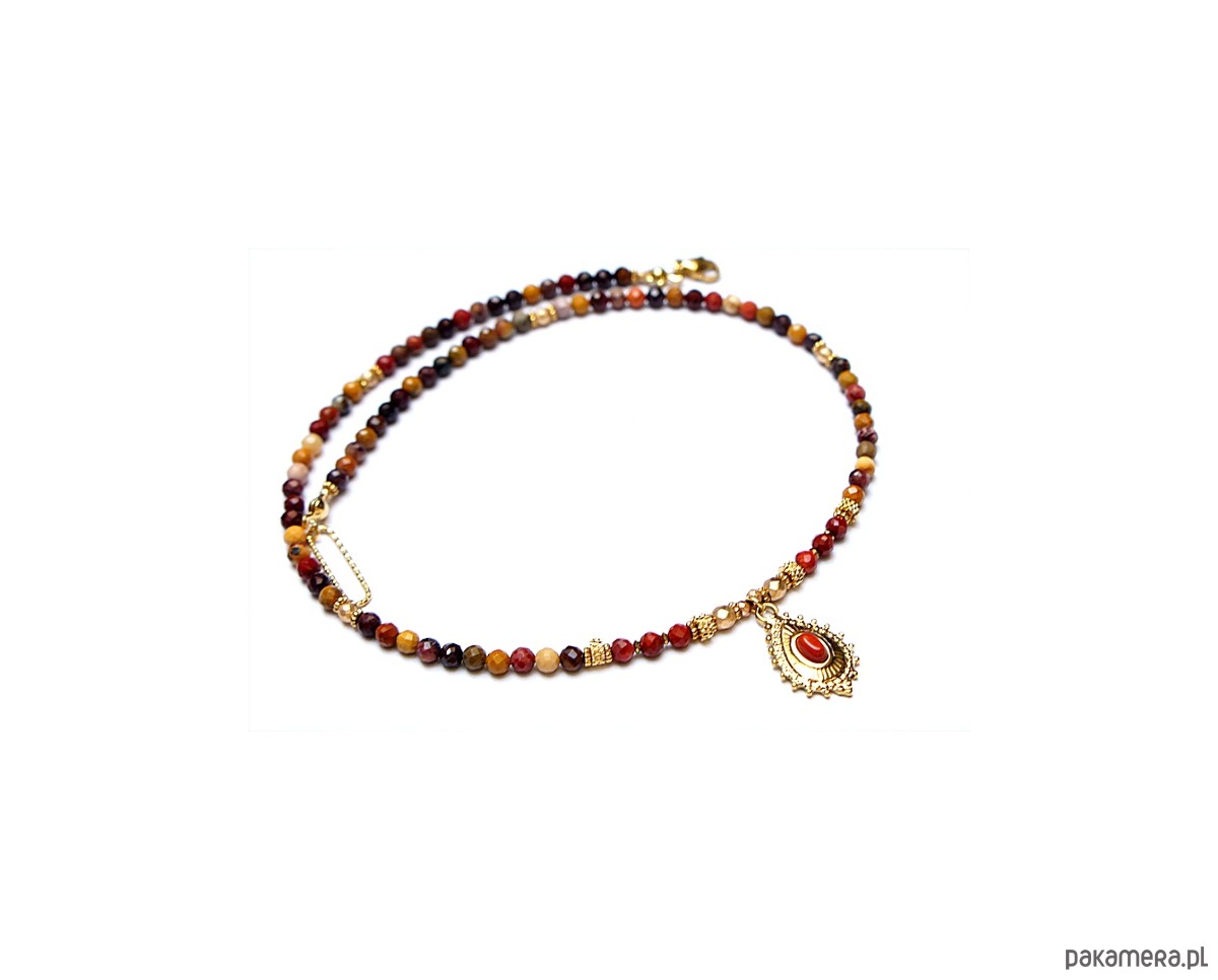 Krótki, delikatny naszyjnik wykonany w całości z pozłacanej stali szlachetnej oraz naturalnych, szlachetnych kamieni - fasetowanego jaspisu mokait [4mm], fasetowanego, platerowanego hematytu [4mm, 3mm i 3 x2mm], przekładek z hematytu [1mm] oraz zawieszki z naturalnym kamieniem. Naszyjnik o długości ok. 44,5cm.