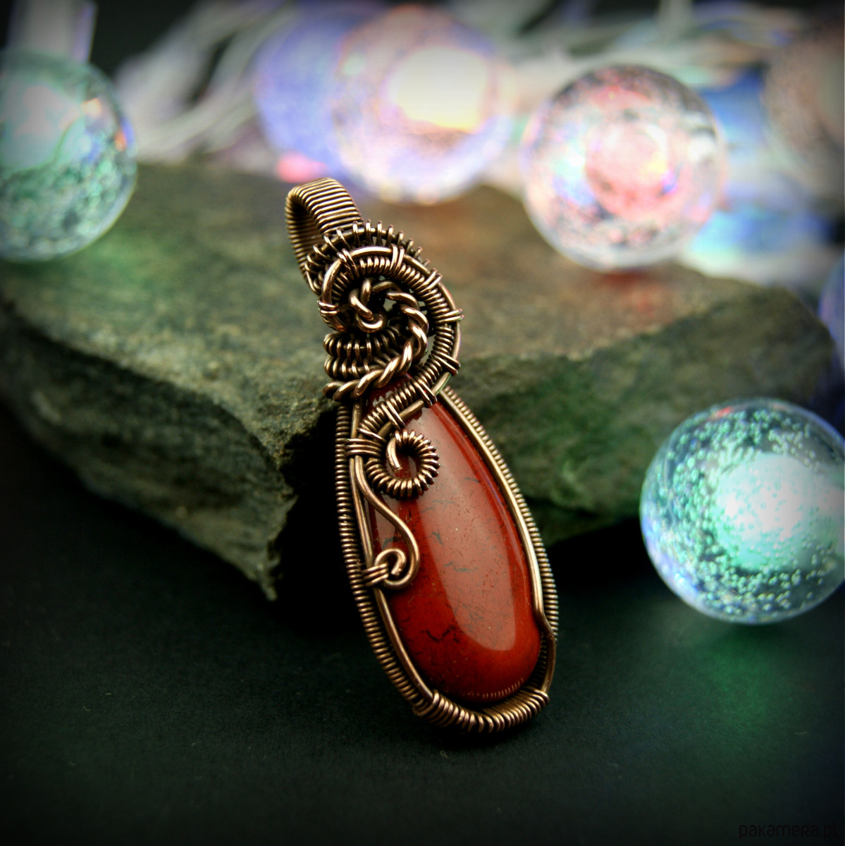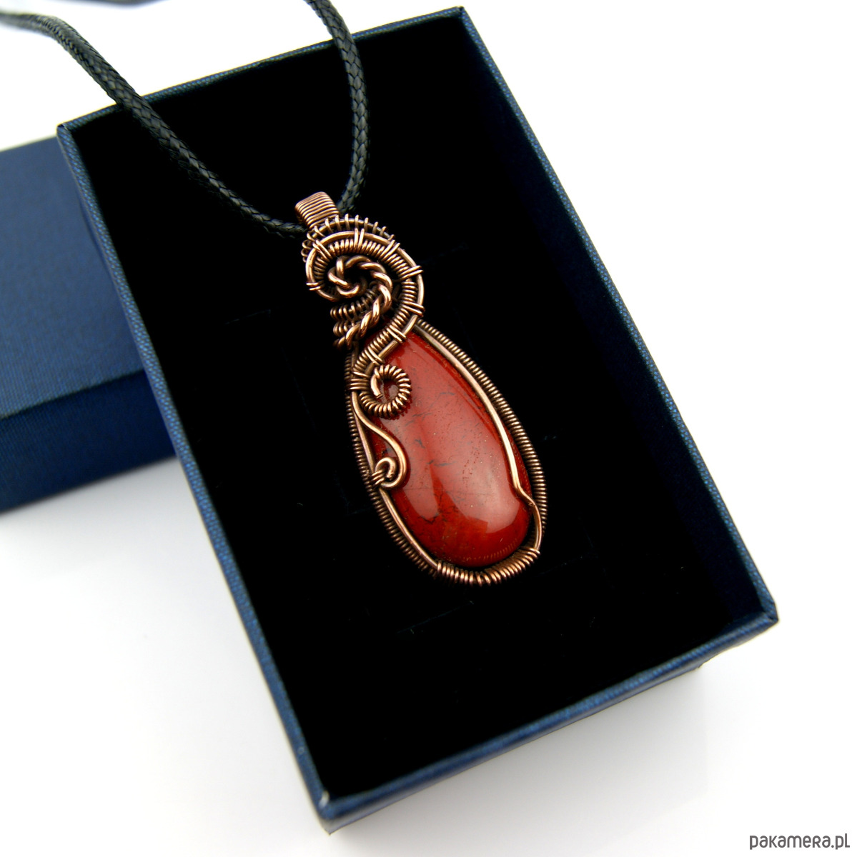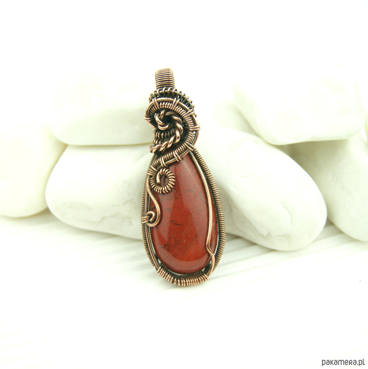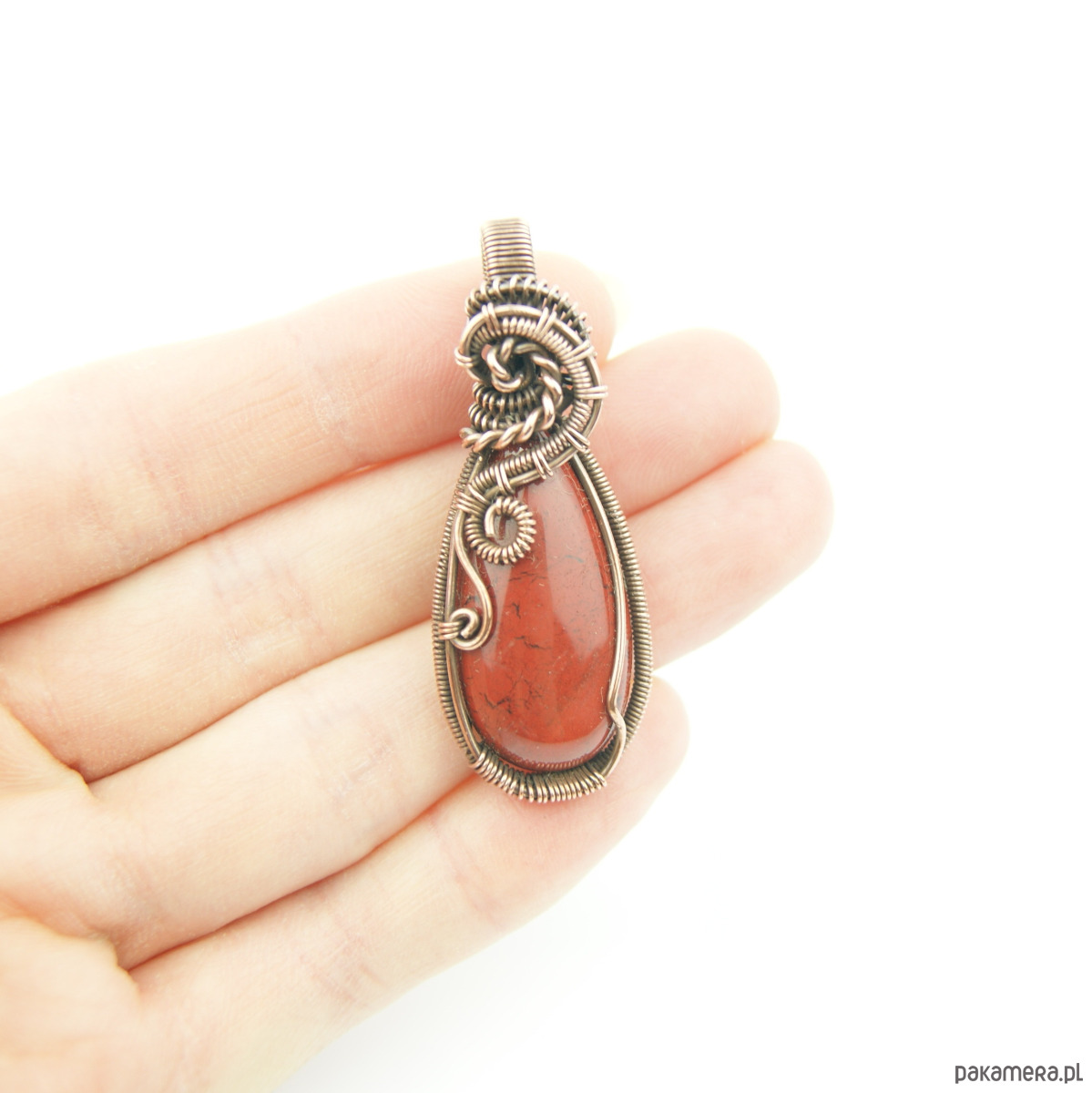 Wisiorek powstał z jaspisu mokaitu w kształcie łezki. Kamień otrzymał misternie plecioną, miedzianą oprawę. Biżuteria wykonana techniką wire wrapping, oksydowana.