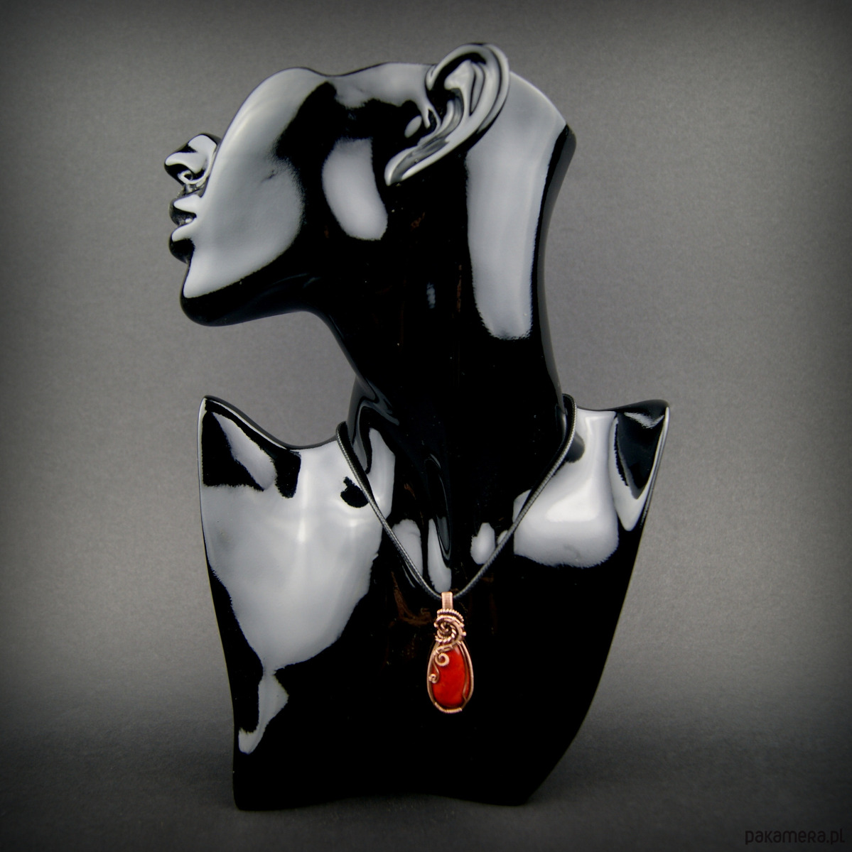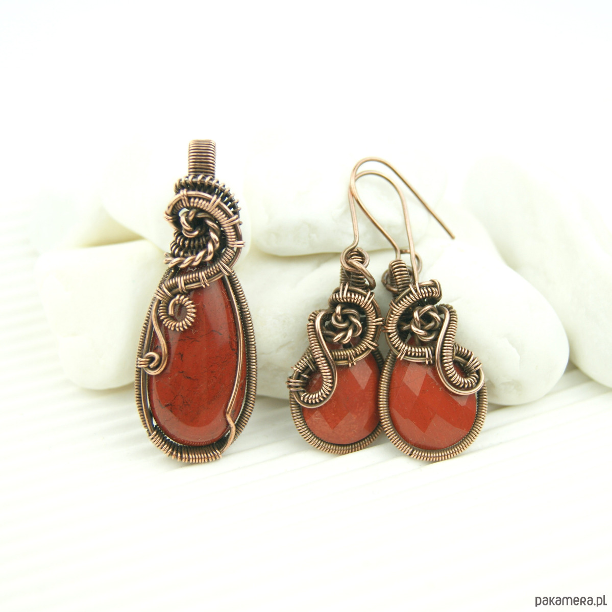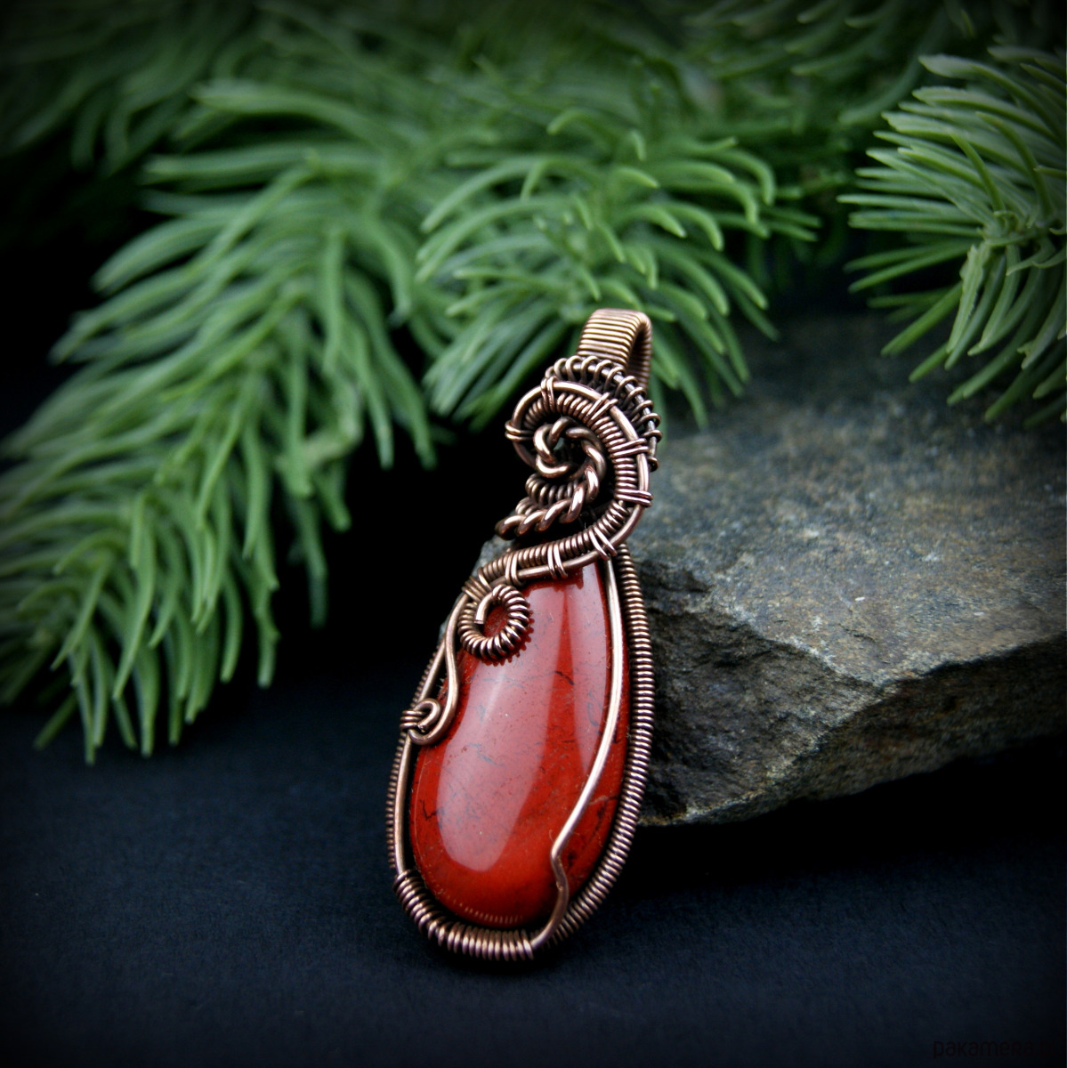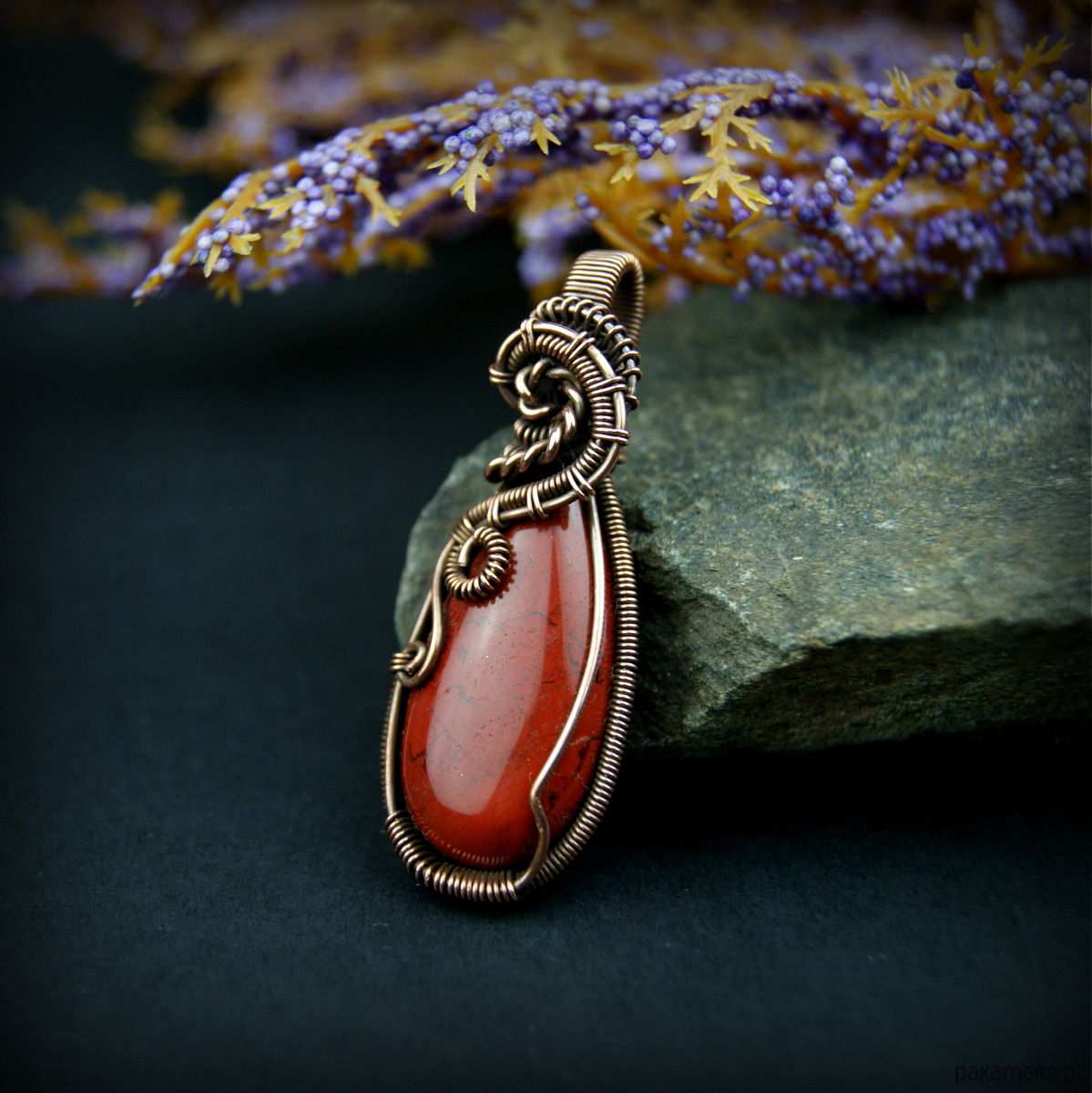 Wisiorek powstał z jaspisu mokaitu w kształcie łezki. Kamień otrzymał misternie plecioną, miedzianą oprawę. Biżuteria wykonana techniką wire wrapping, oksydowana.